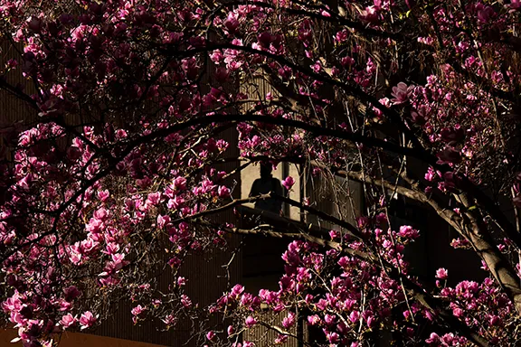 A student is seen through the pinks blooms of magnolia tree outside Briggs Hall
