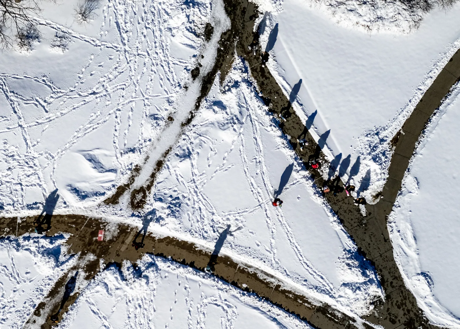 Students cast long shadows as they walk on campus the day after a major snowstorm including one who trailblazed their own path.