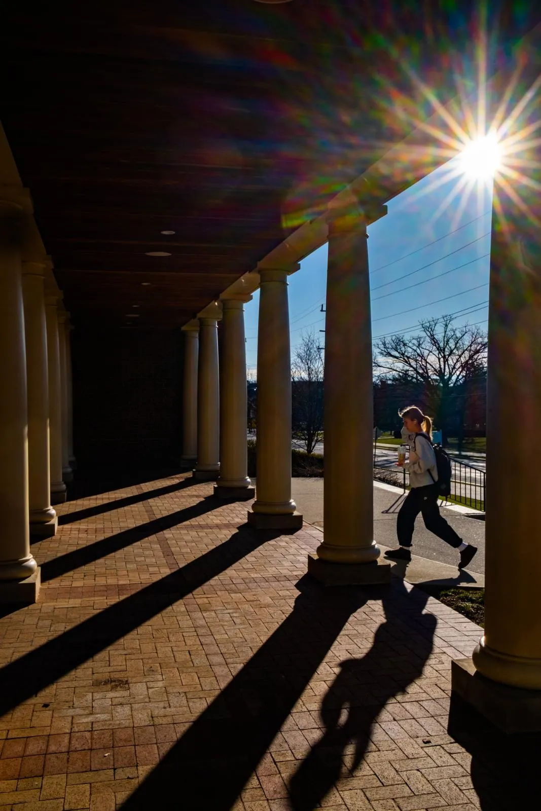 Student makes her way to class with the sunrising to begin a new day of learning.