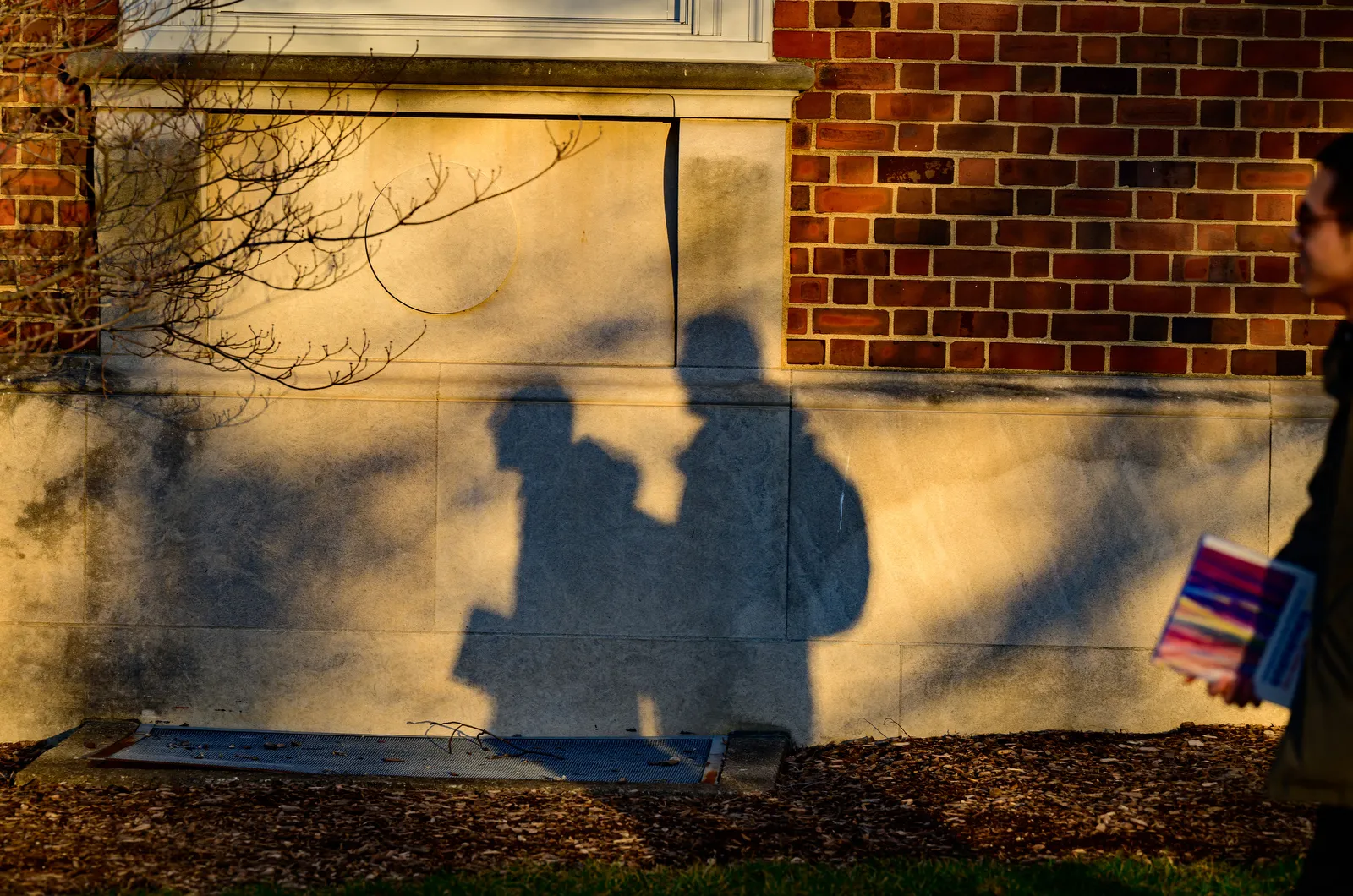 A setting sun casts long shadows as student pass by the union as they cross campus.