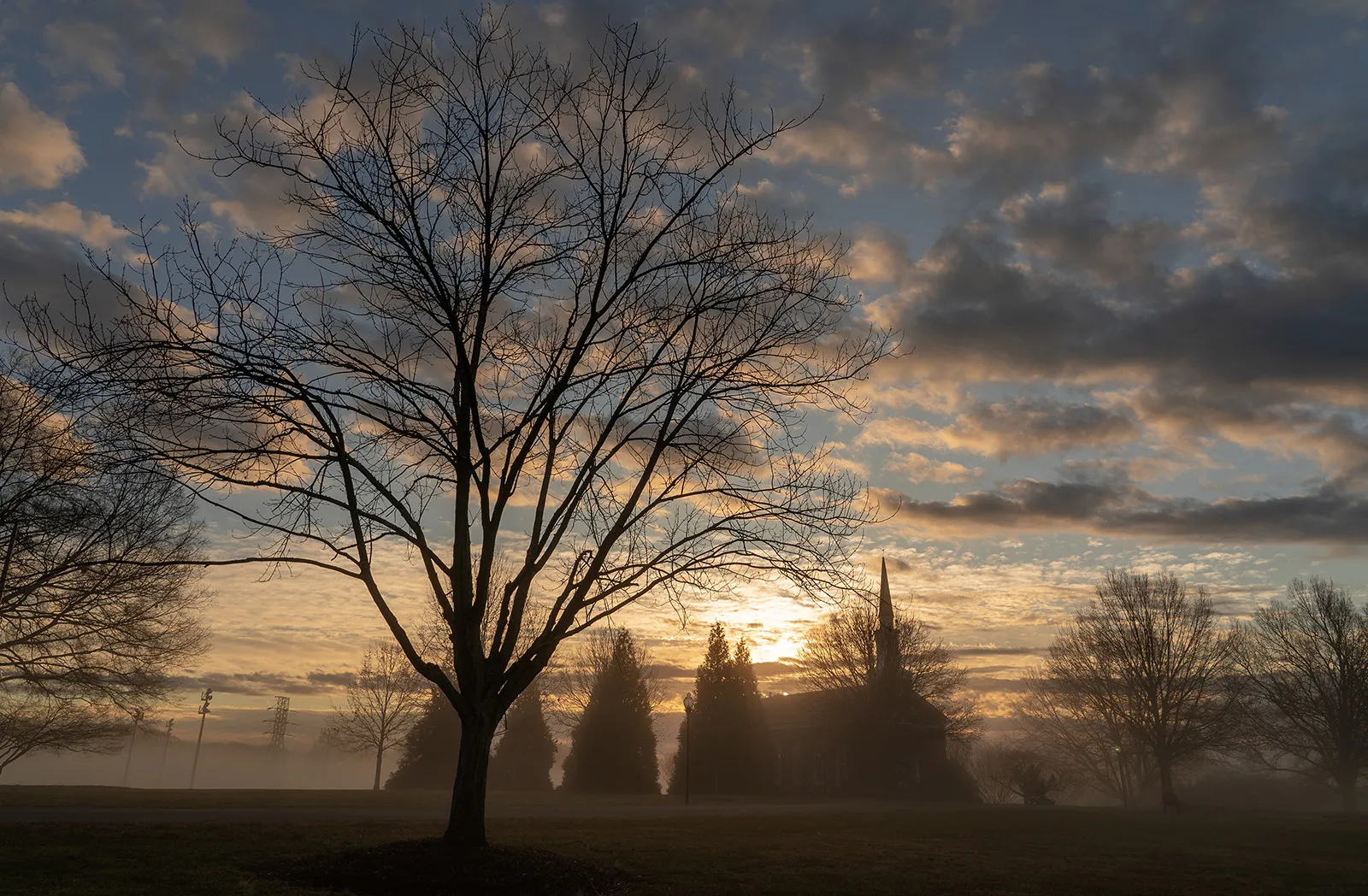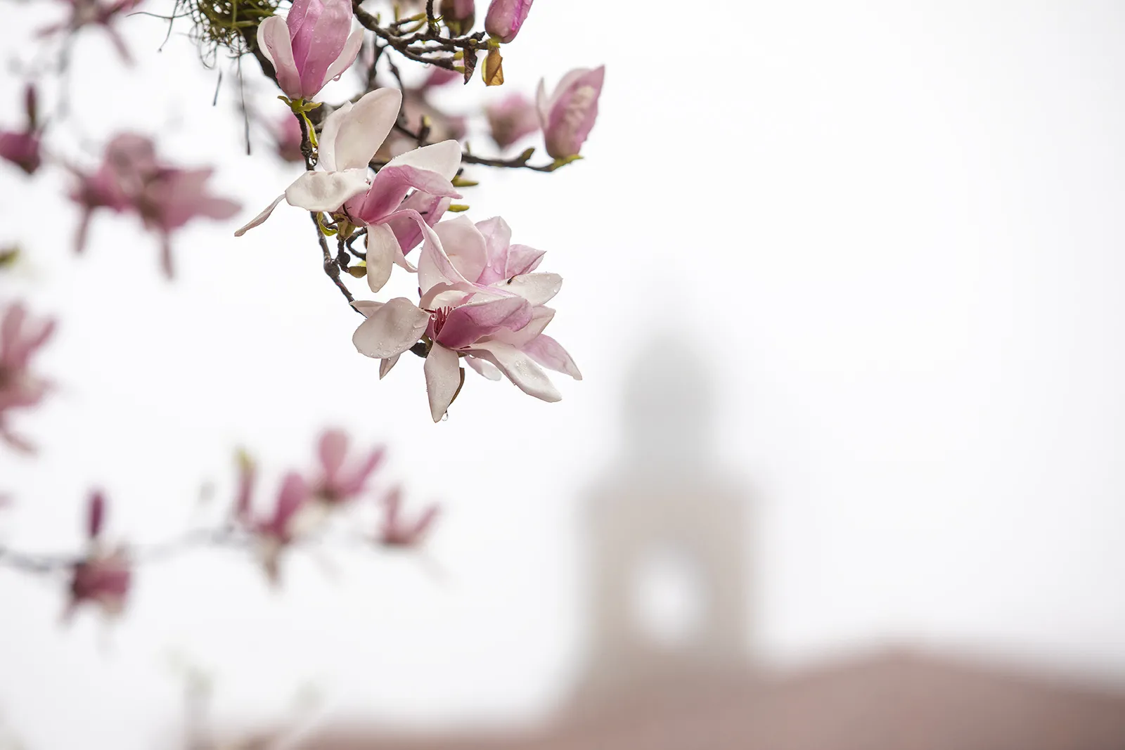A Saucer Magnolia blooming on a foggy morning with Atkinson Hall in the background.