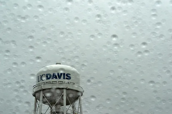The UC Davis Water Tower in the rain during a heavy rain storm, as seen thru a rainy splattered window.