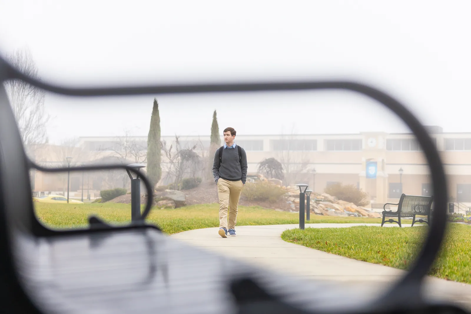 A student is pictured through lights as he walks through the empty Boston campus before the holiday break.