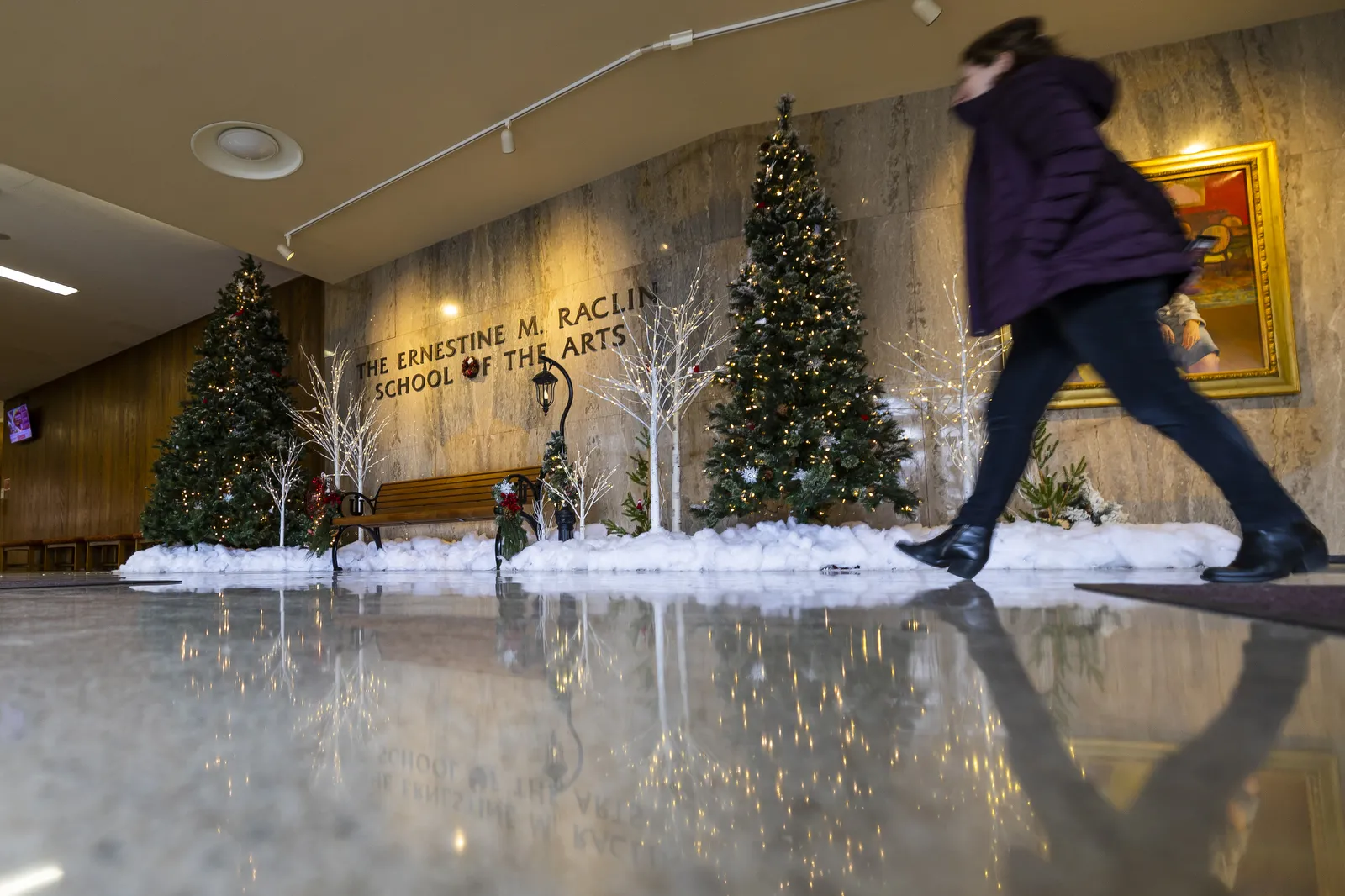 Jennifer Muñiz walks by a display of evergreen trees and lights with birds on them in the Ernestine M. Raclin School of the Arts performance hall in Northside Hall Tuesday, Dec. 13, 2022 on campus at IUSB.