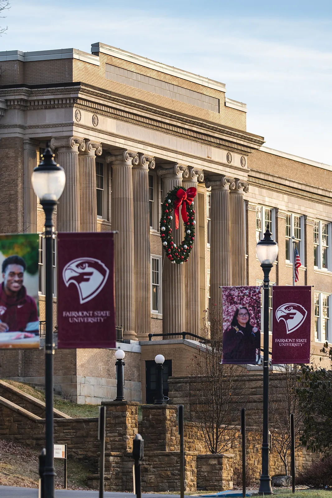 At 107 years old, Hardway hall is the oldest building on the Fairmont State University Campus. This photograph was taken at sunrise on a cold December morning and features a few of the banners that adorn the light poles that guide students through campus.