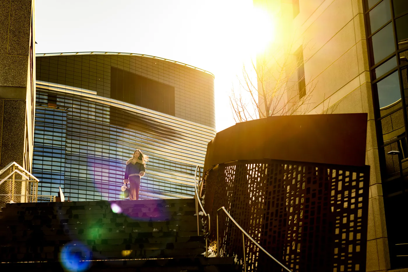 A student walks across the Industrial Science and Engineering Complex bridge which connects the Boston campus otherwise divided by the orange line train.