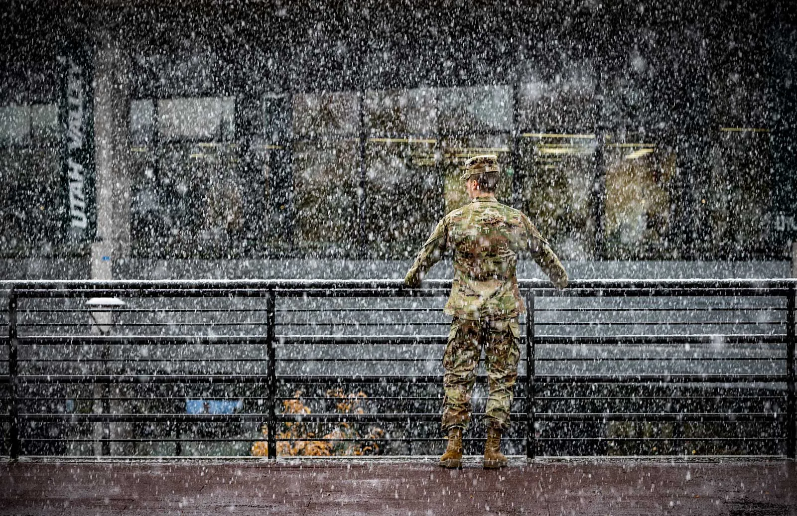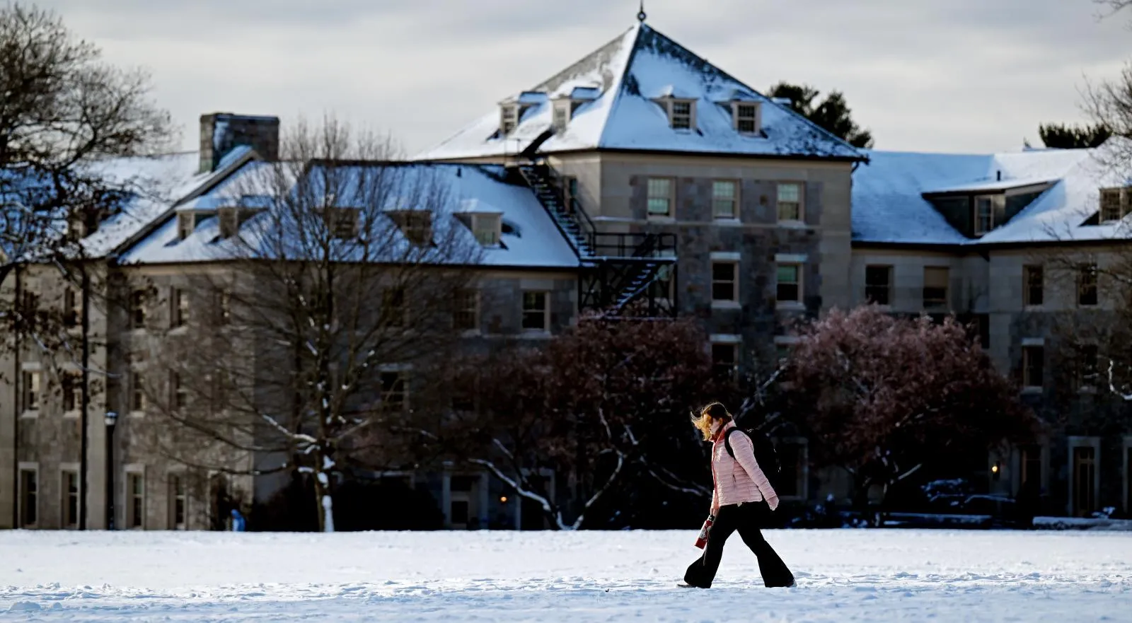 A students walks across Tempel Green after the first snow of the 2022-2023 school year at Connecticut College Monday, December 12, 2022.