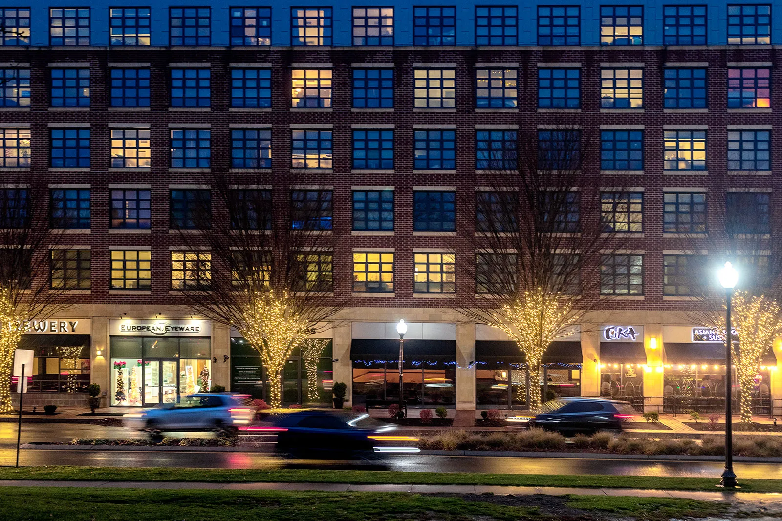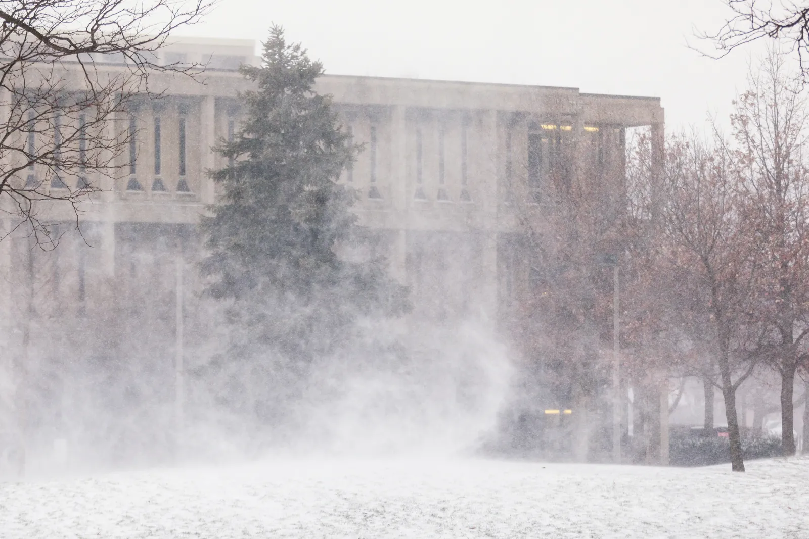 College Row is a set of campus apartments affectionately referred to as Crow by students. During the holidays, twinkle lights add some cheer, even on a dreary December evening.