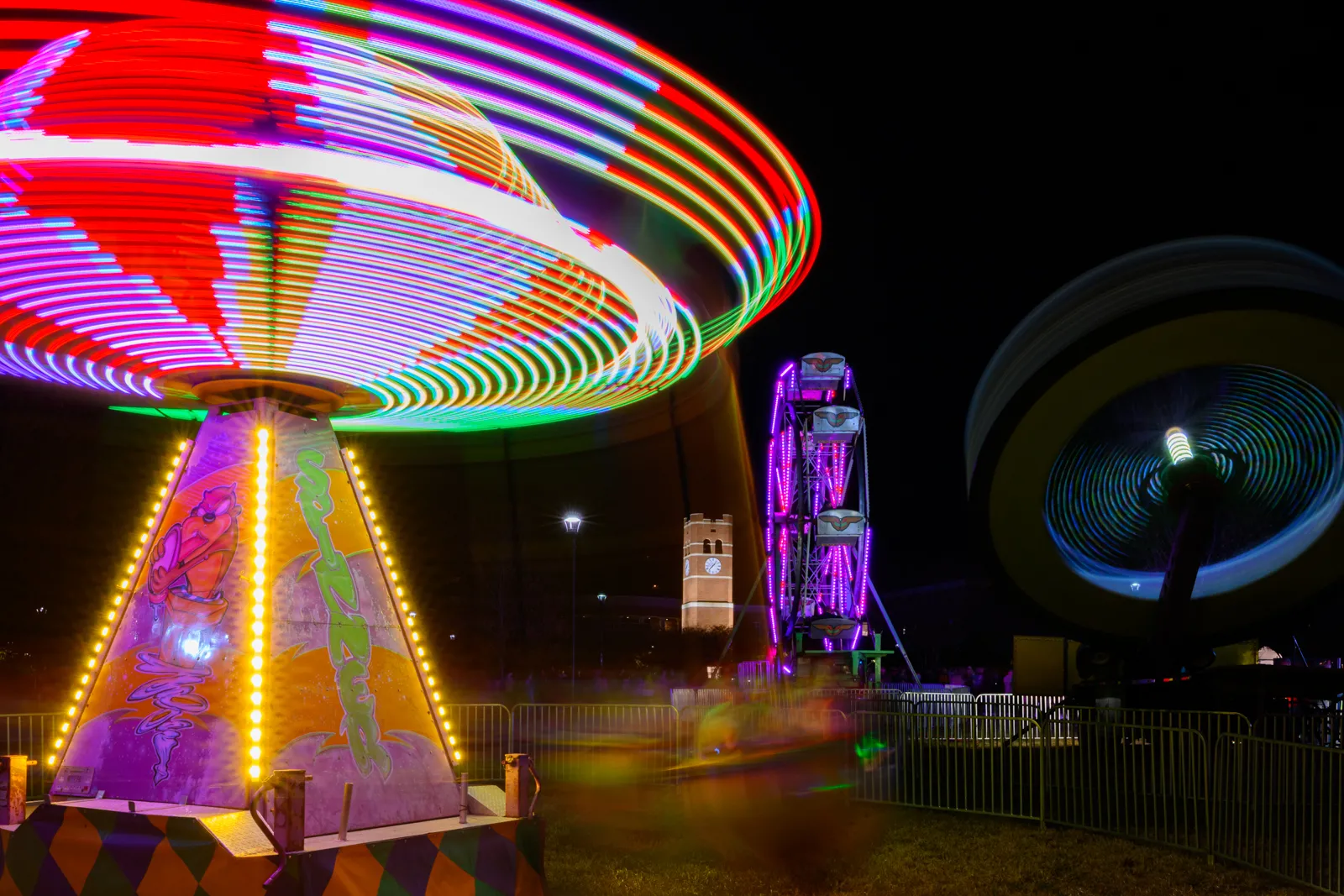 The Alumni Tower stands tall as the homecoming carnival lights up campus.