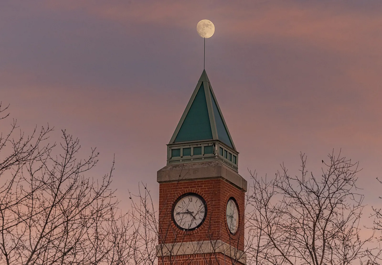 The moon appears to sit atop the clocktower on December 5, 2022.