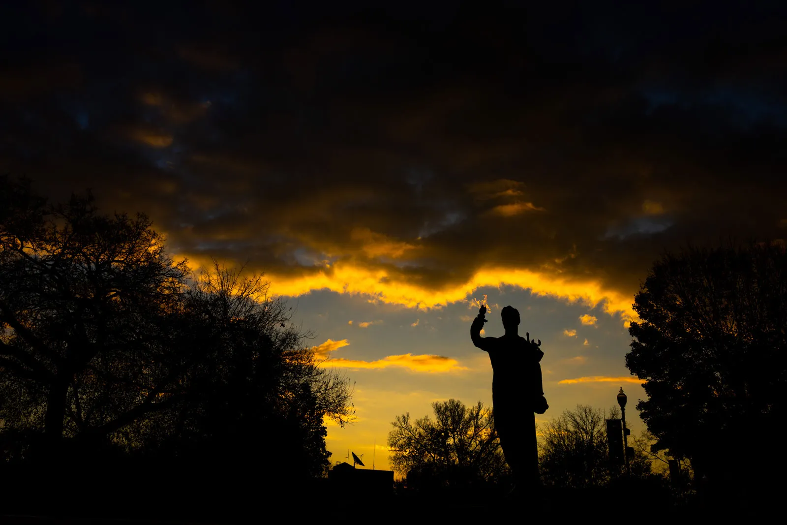 The Torchbearer statue stands out in a break of the early morning clouds.