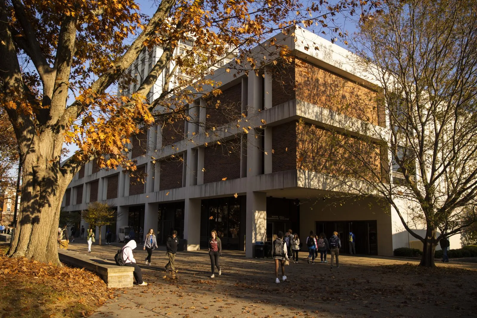 The crisp colors of fall foliage surrounding the iconic Stephens hall on Towson's campus.