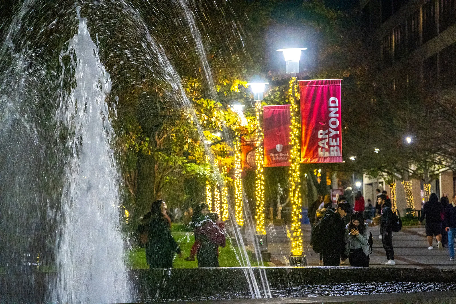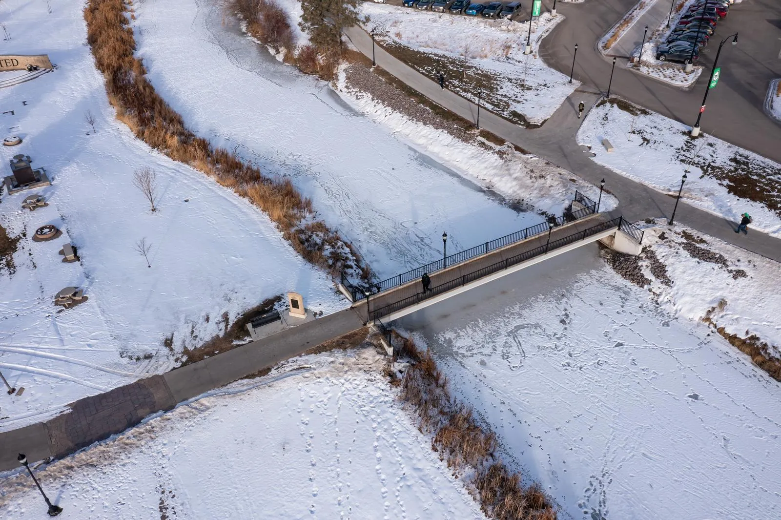 Students crossing the frozen English Coulee. The coulee is popular with students to skate or play ice hockey on.