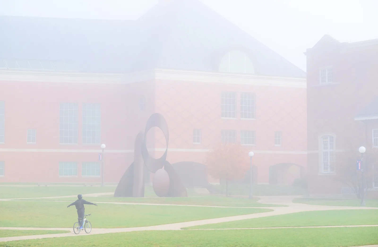 A bicycle rider spontaneously throws out his arms, celebrating the moment as fog shrouds Bardeen Quad in muted hues.