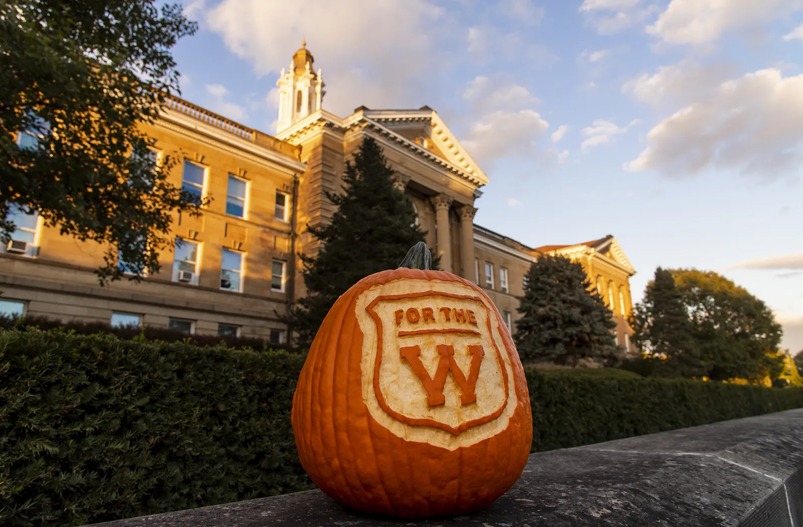 A university community member carved a "For the W" pumpkin for Halloween in celebration of the university's new fundraising campaign. The pumpkin is pictured in front of Sherman Hall.