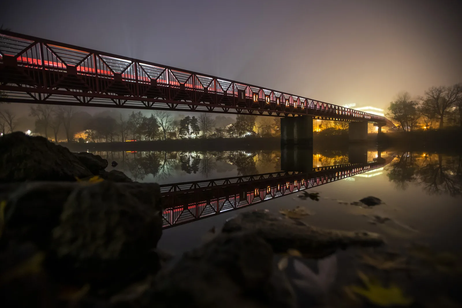 Fog visible near the pedestrian bridge over the Saint Joseph River Monday, Oct. 31, 2022 on campus at IUSB