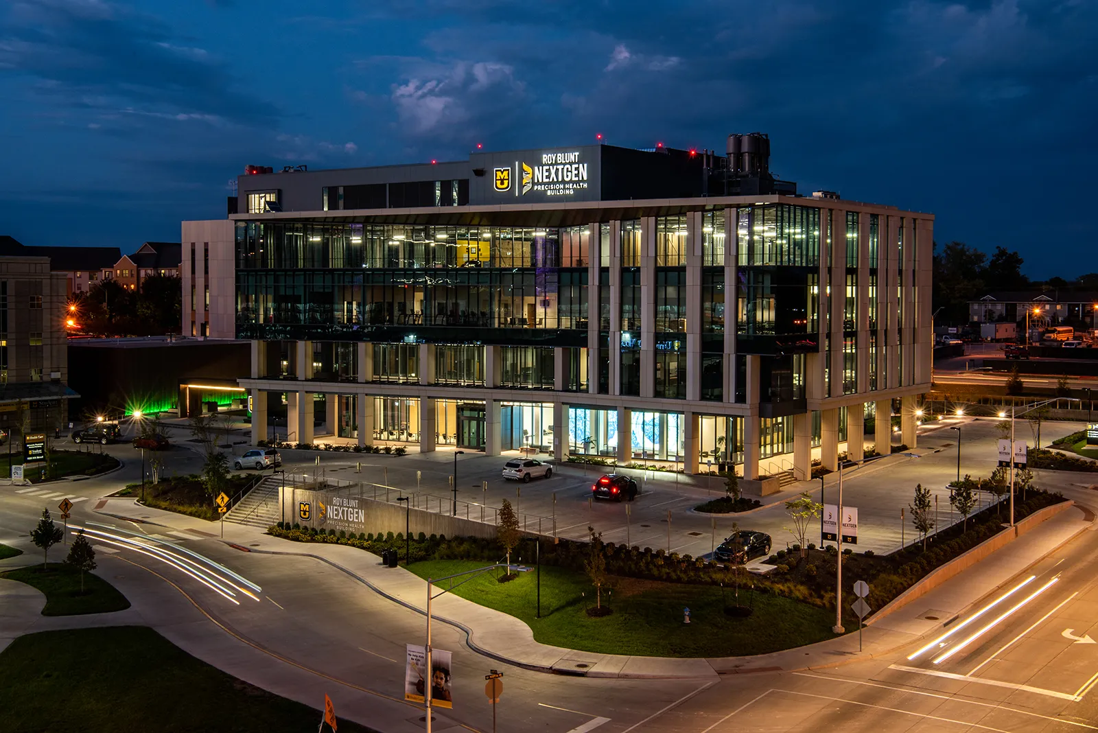Long exposure image of the Roy G. Blunt NextGen Precision Health Building. Shot at dusk from the top of a parking garage.