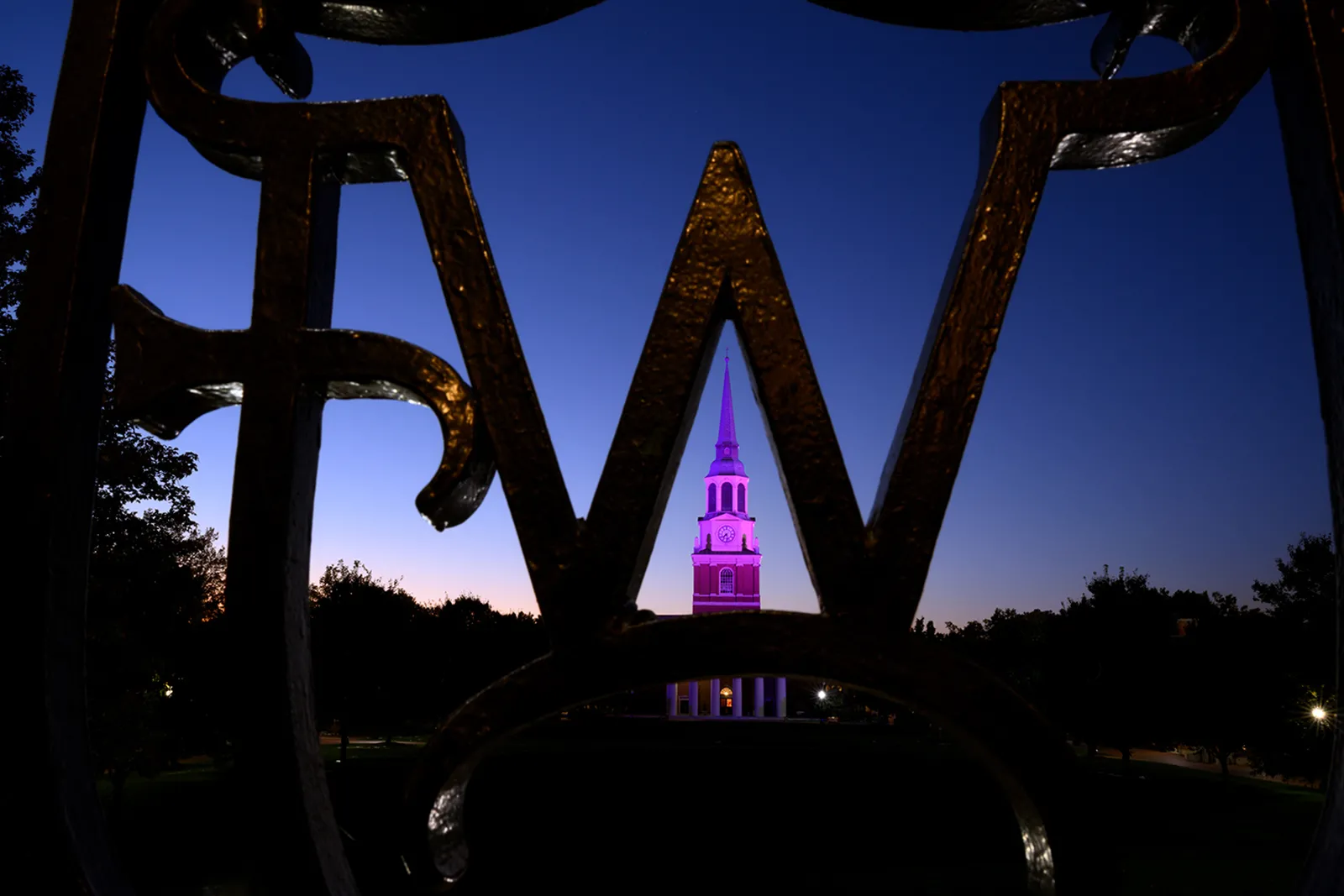 The chapel is seen illuminated with pink lights as the sun sets on a beauitful fall night.