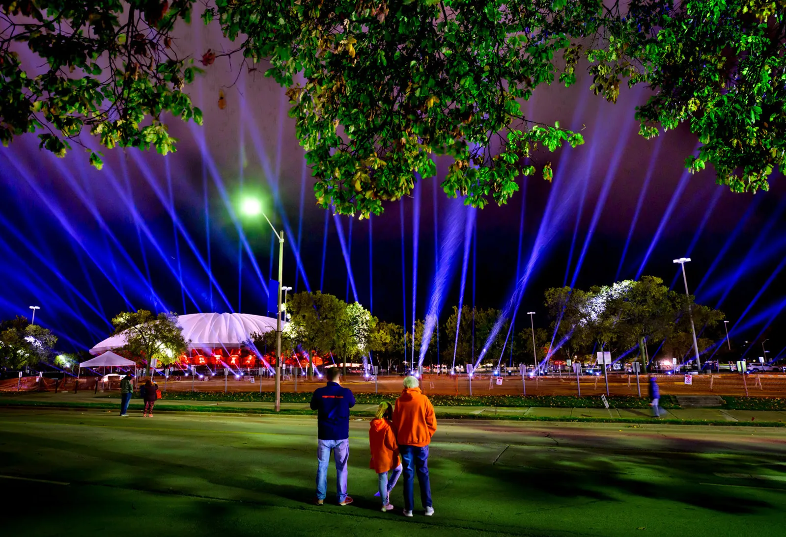 A homecoming pep rally culminates with a spotlight show over the horizon with the lights pulsing to the music of the marching band.