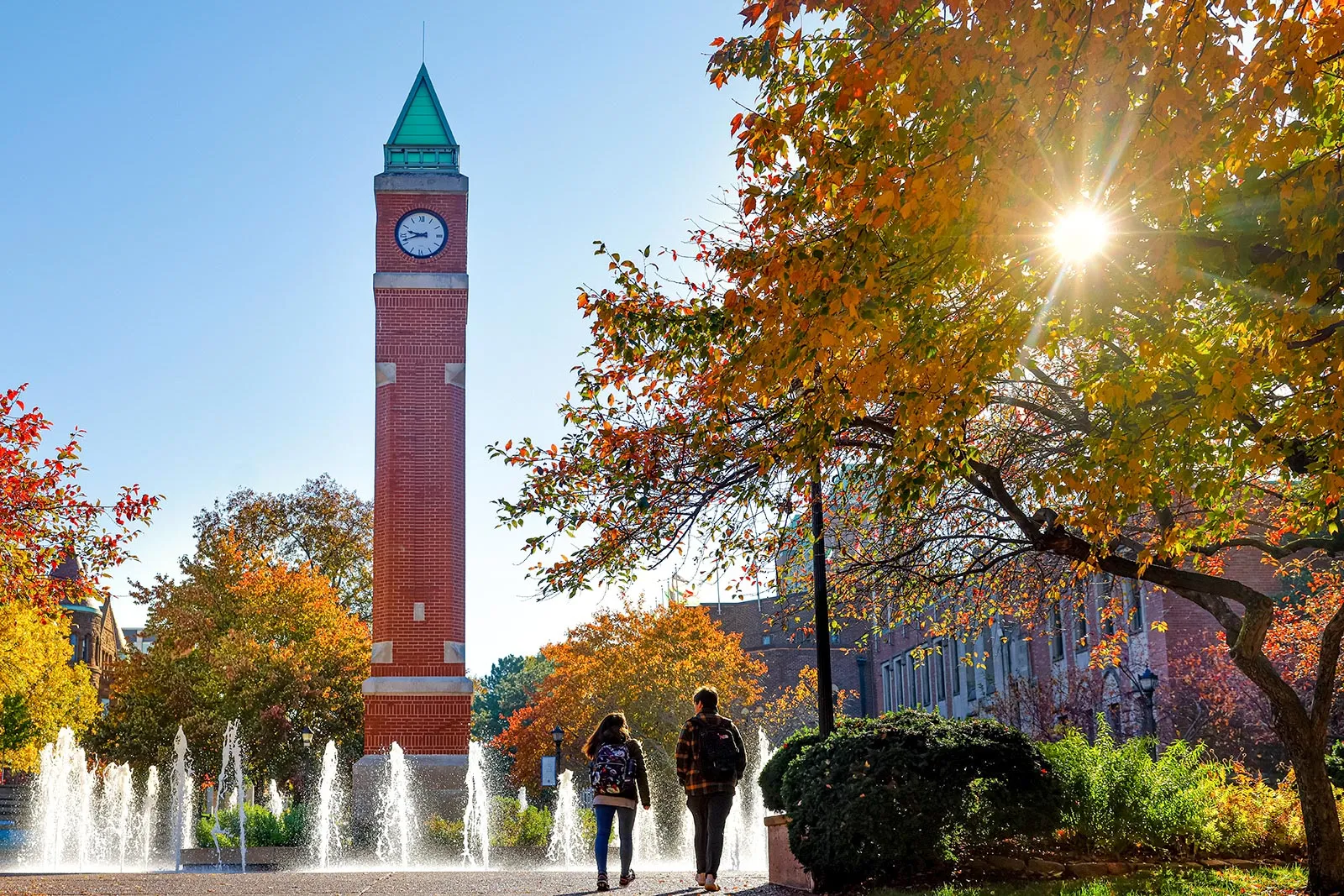 Two students walk past the clock tower amidst the fall colors in the morning light of October 26, 2022.