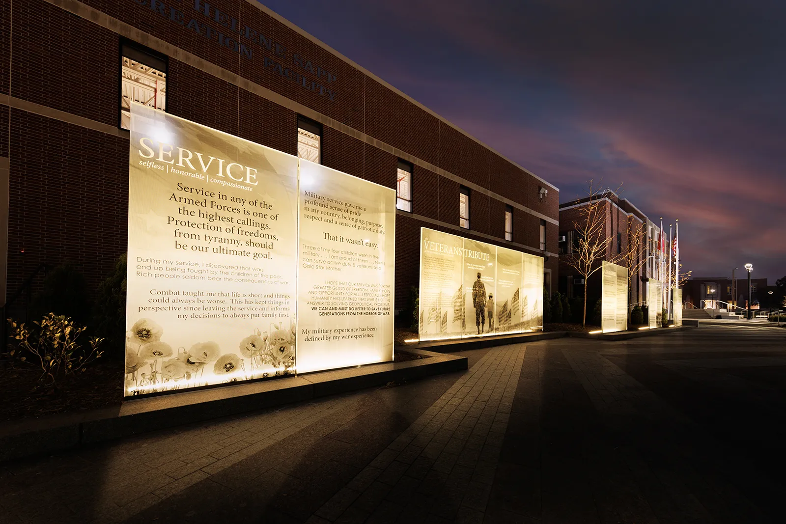 University of Nebraska-Lincoln honors veterans, military service members, and military families with this Veterans’ Tribute. Running along Memorial Mall outside the Pershing Military and Naval Science building, this area serves as a tribute to those willing to sacrifice for something larger than themselves and a space to reflect on all that their courage affords us.