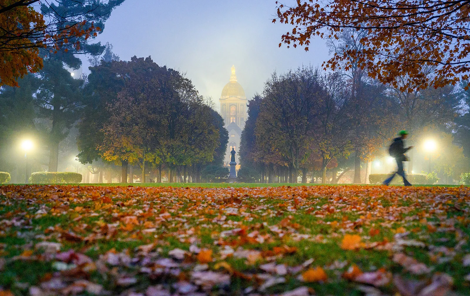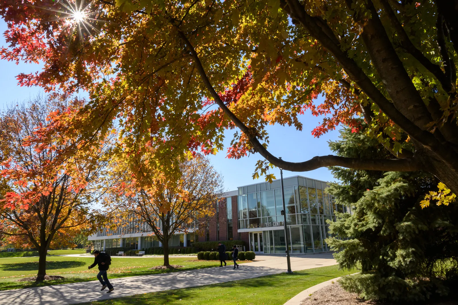 A person is seen walking past the Daniel and Pamella DeVos Center for Interprofessional Health on GVSU's Health Campus October 21.