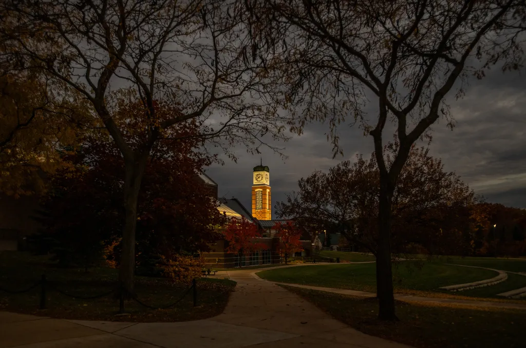 A cloudy sunrise cast a warm glow on the Cook Carillon Tower on October 24.
