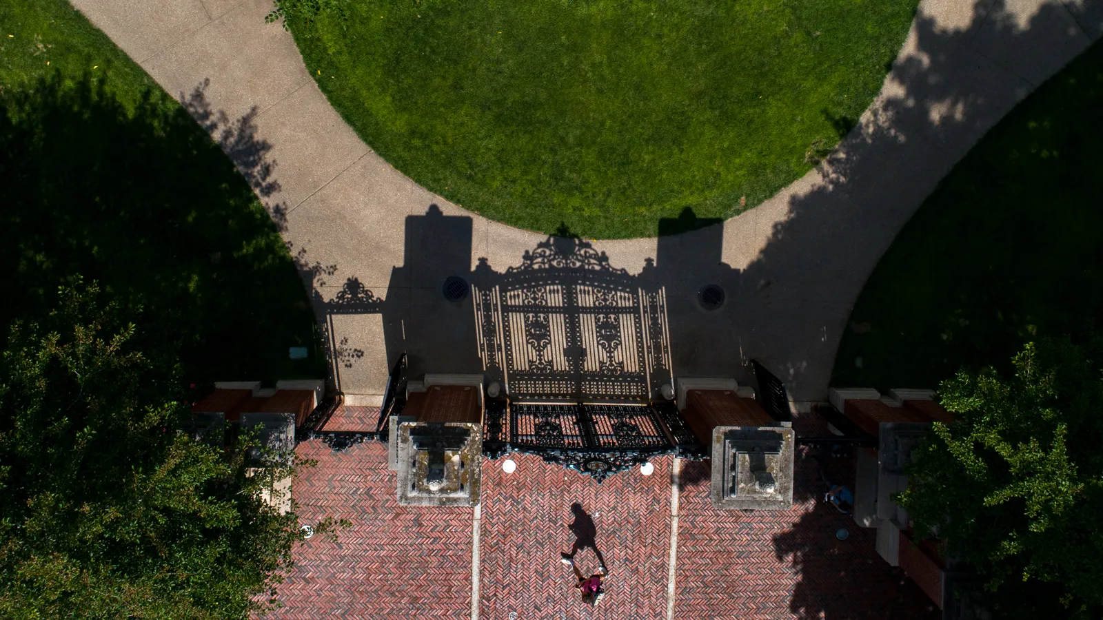 The Van Wickle Gates cast shadows onto the Quiet Green as a student walks past in the evening sunlight. While the student population wains in the summer, many still remain for a summer semester and a number of pre-college students take to the grounds to explore.