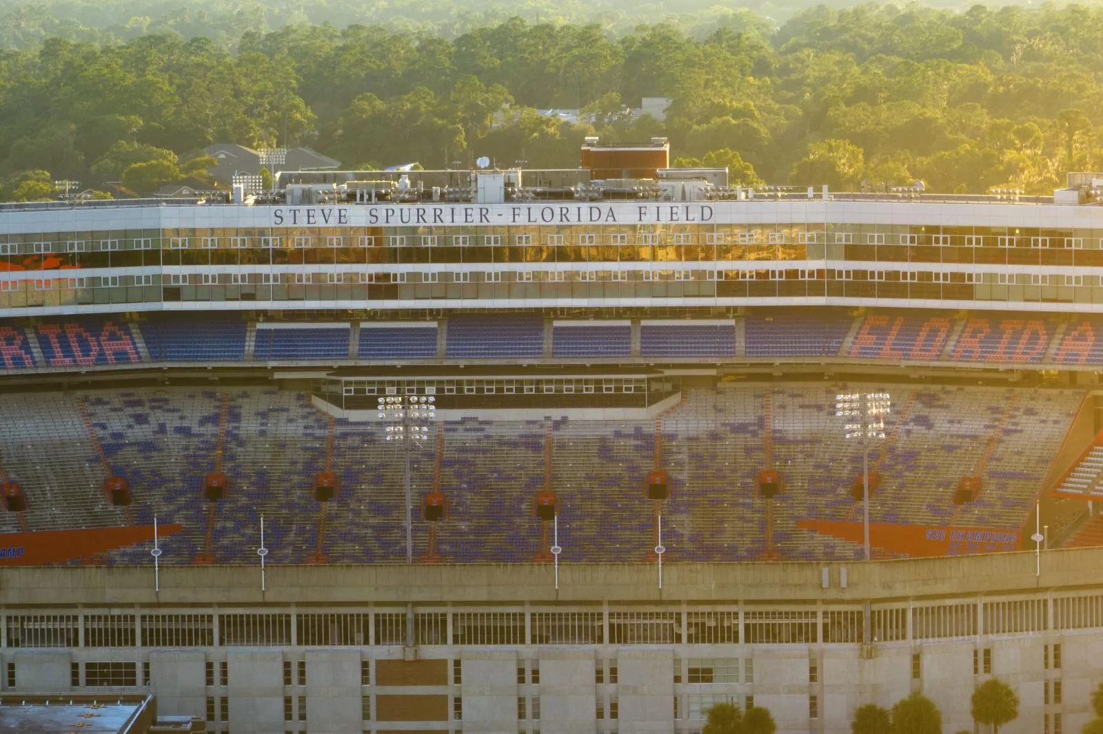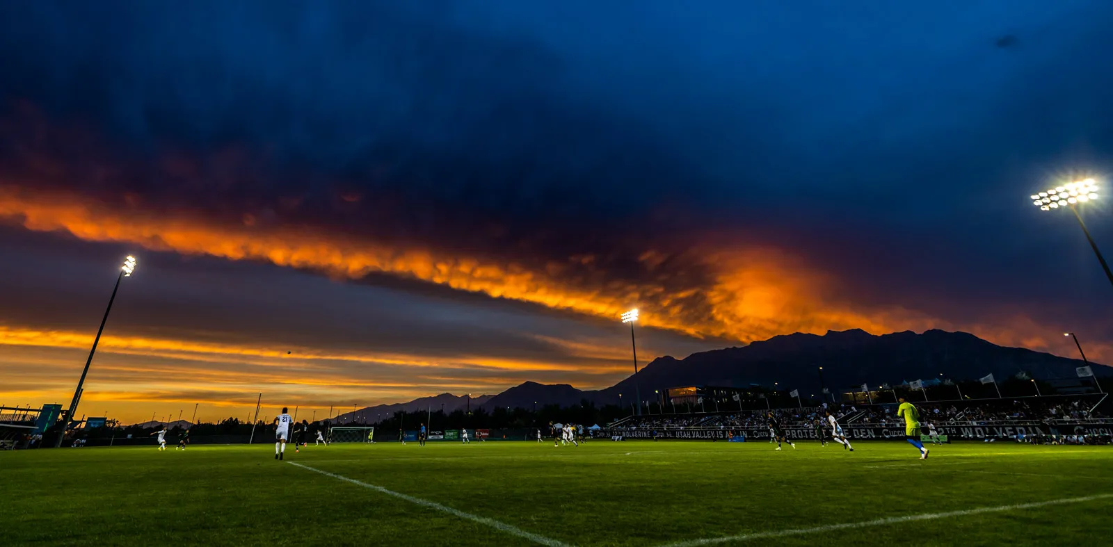 Colorful clouds light the sky moments after the sunset over campus during the opening game of the men's soccer season.
