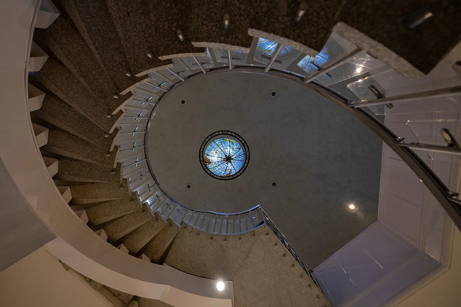 A view of the spiral staircase winding up the rotunda in Kendall Hall on Monday, July 18, 2022 in Chico, Calif.