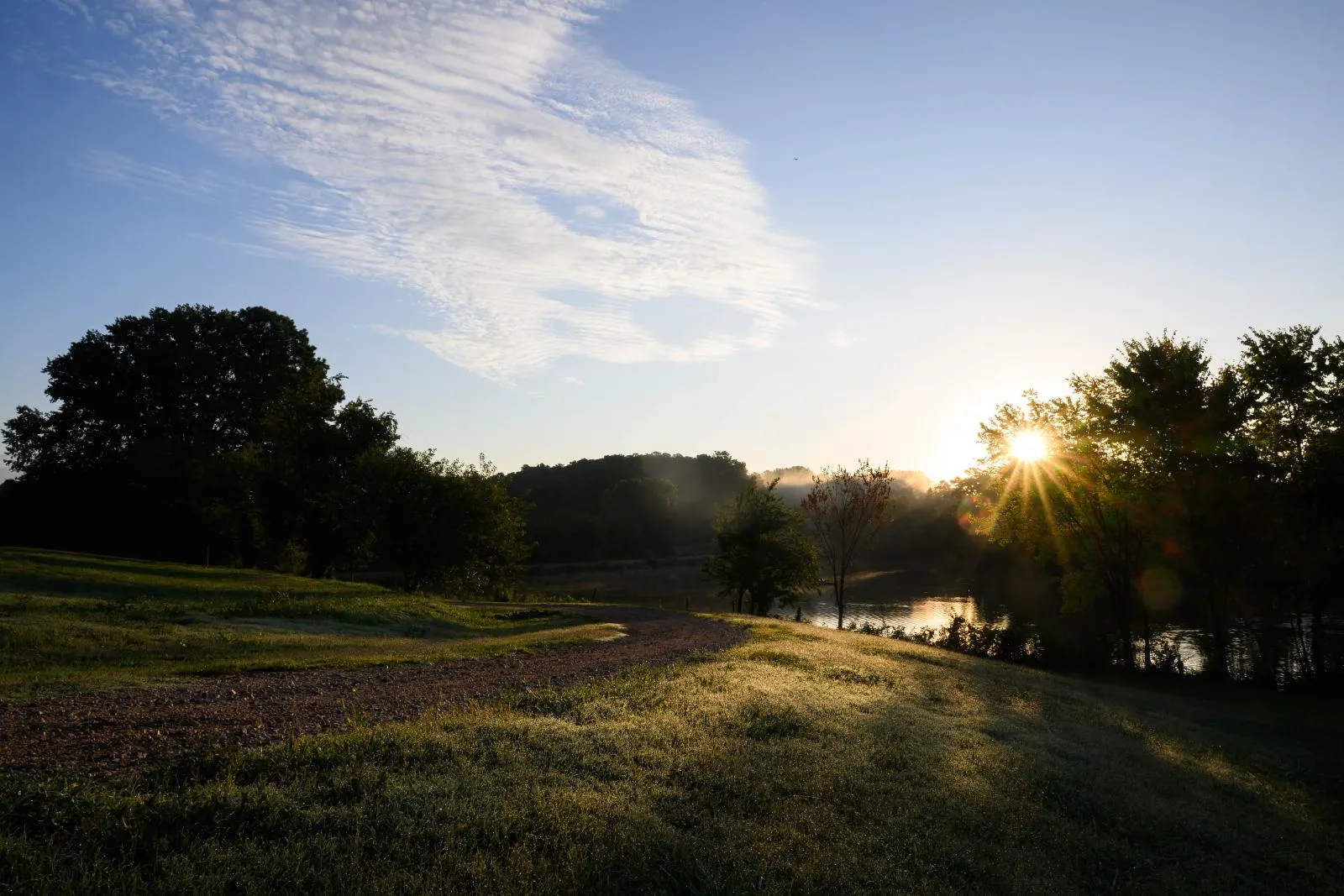 The sun rises over the lake at the NC State College of Veterinary Medicine's Teaching Animal Unit, a working farm that provides learning opportunities for the college's students.