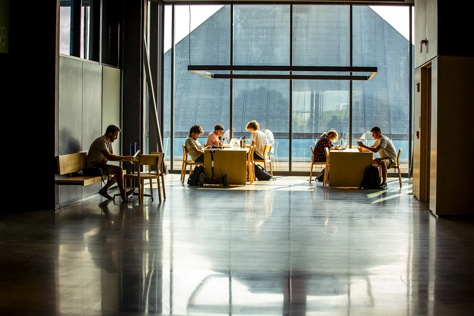 2 students silhouetted against the Kreitman-Zlotoswki classroom building