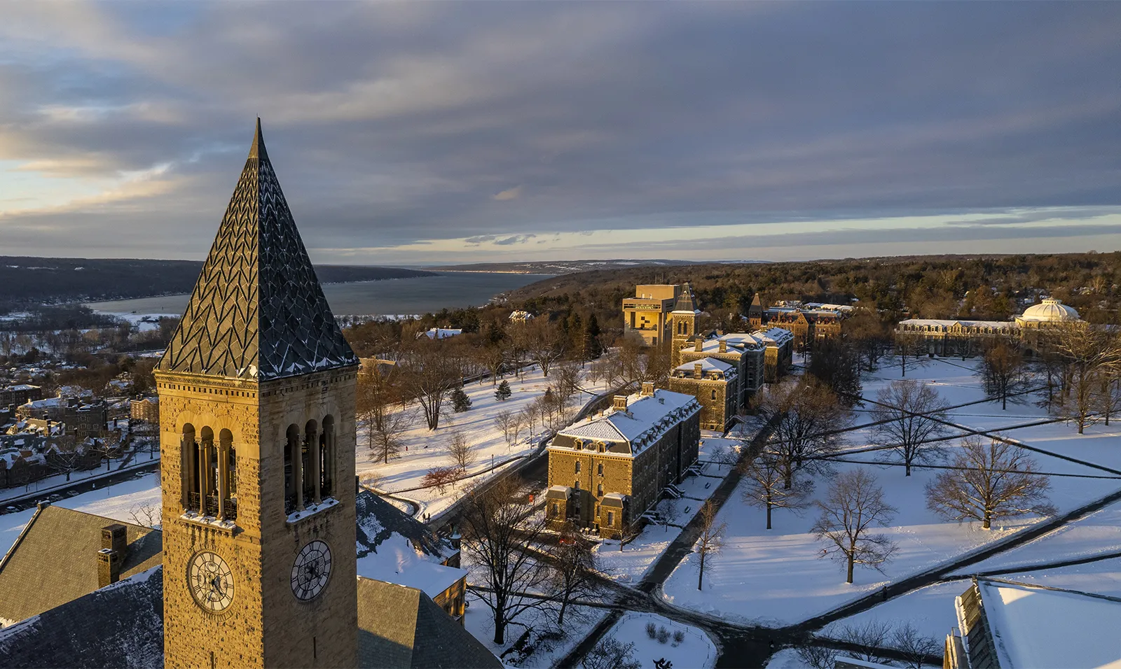 McGraw Tower is seen at sunset with the Arts Quad and Cayuga Lake in the background following a mid-winter snowfall that dropped 4-6 inches of precipitation on Cornell's campus.
