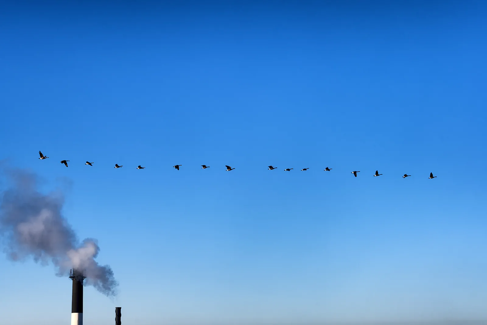 Canadian Geese fly single-file past the university power plant on a cold January morning.