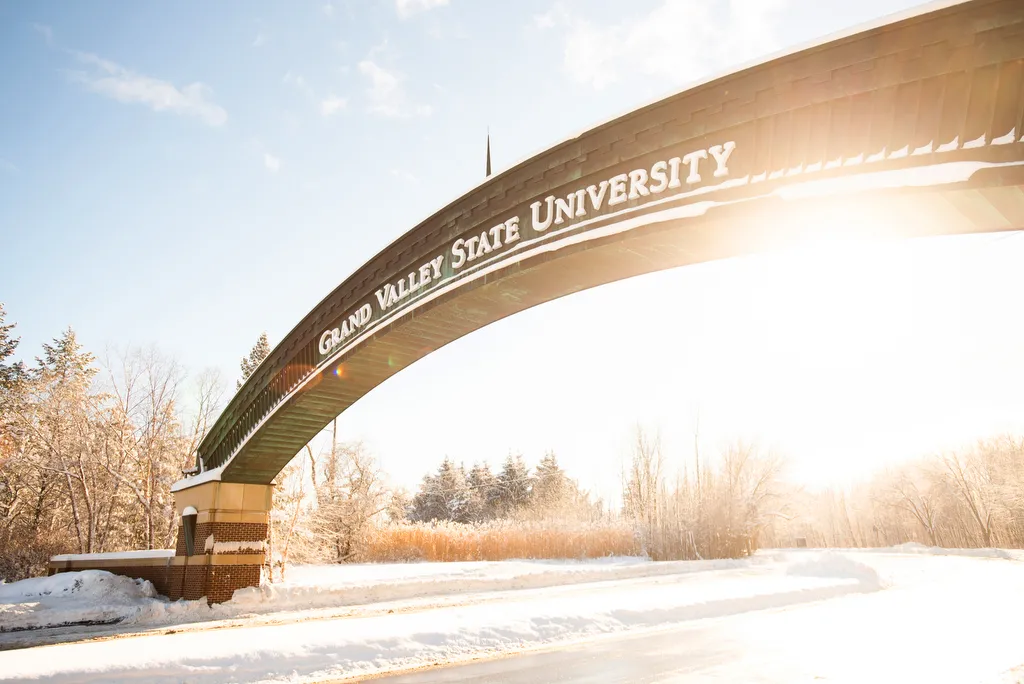 A winter sunrise illuminates the Grand Valley State University arch as you enter campus January 7.