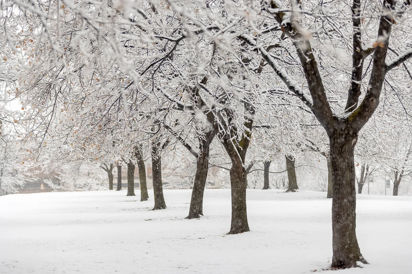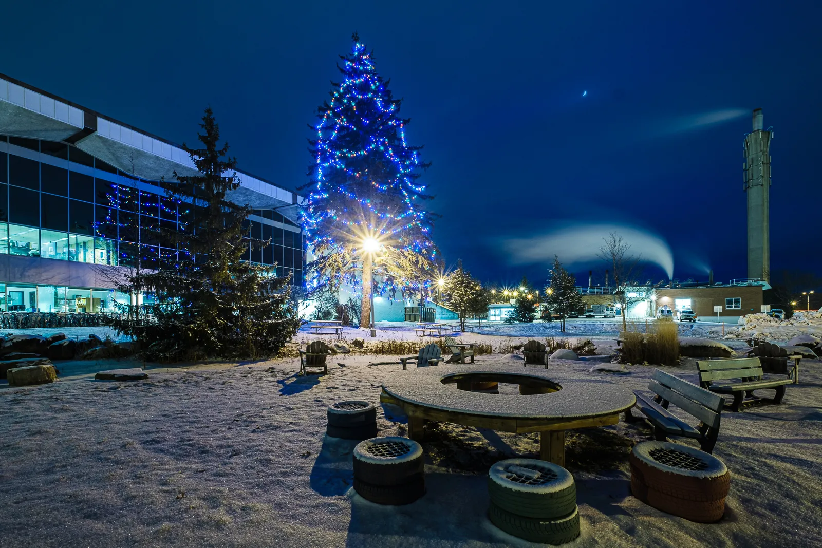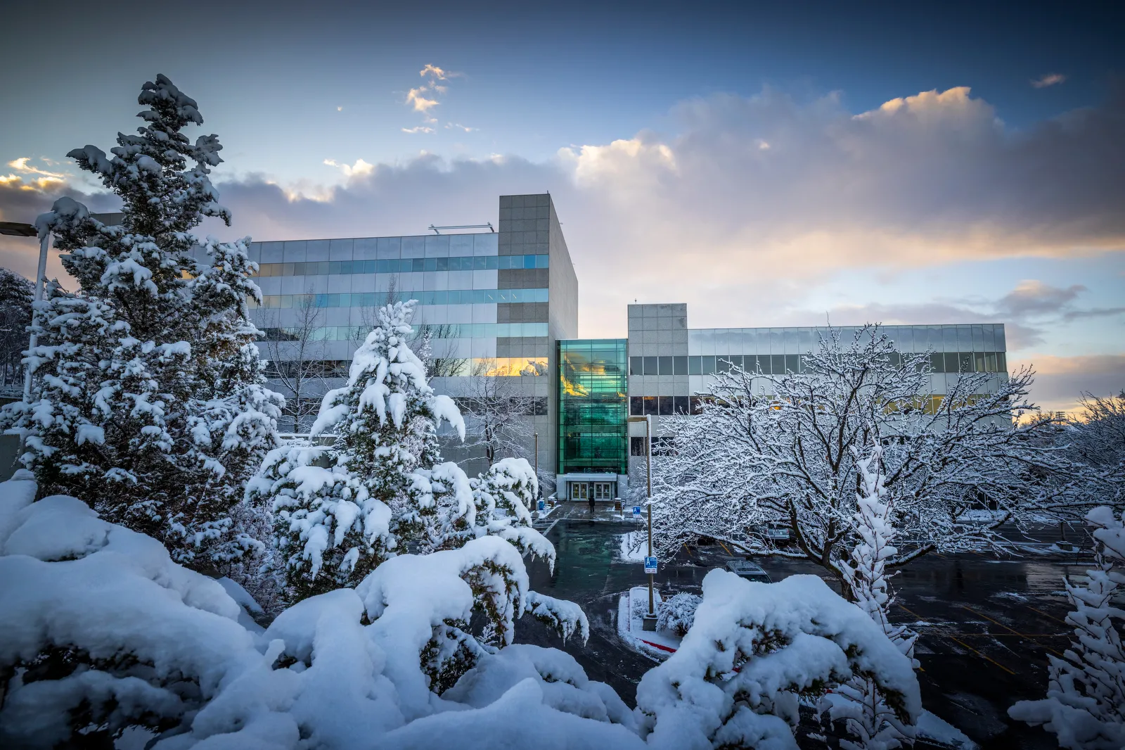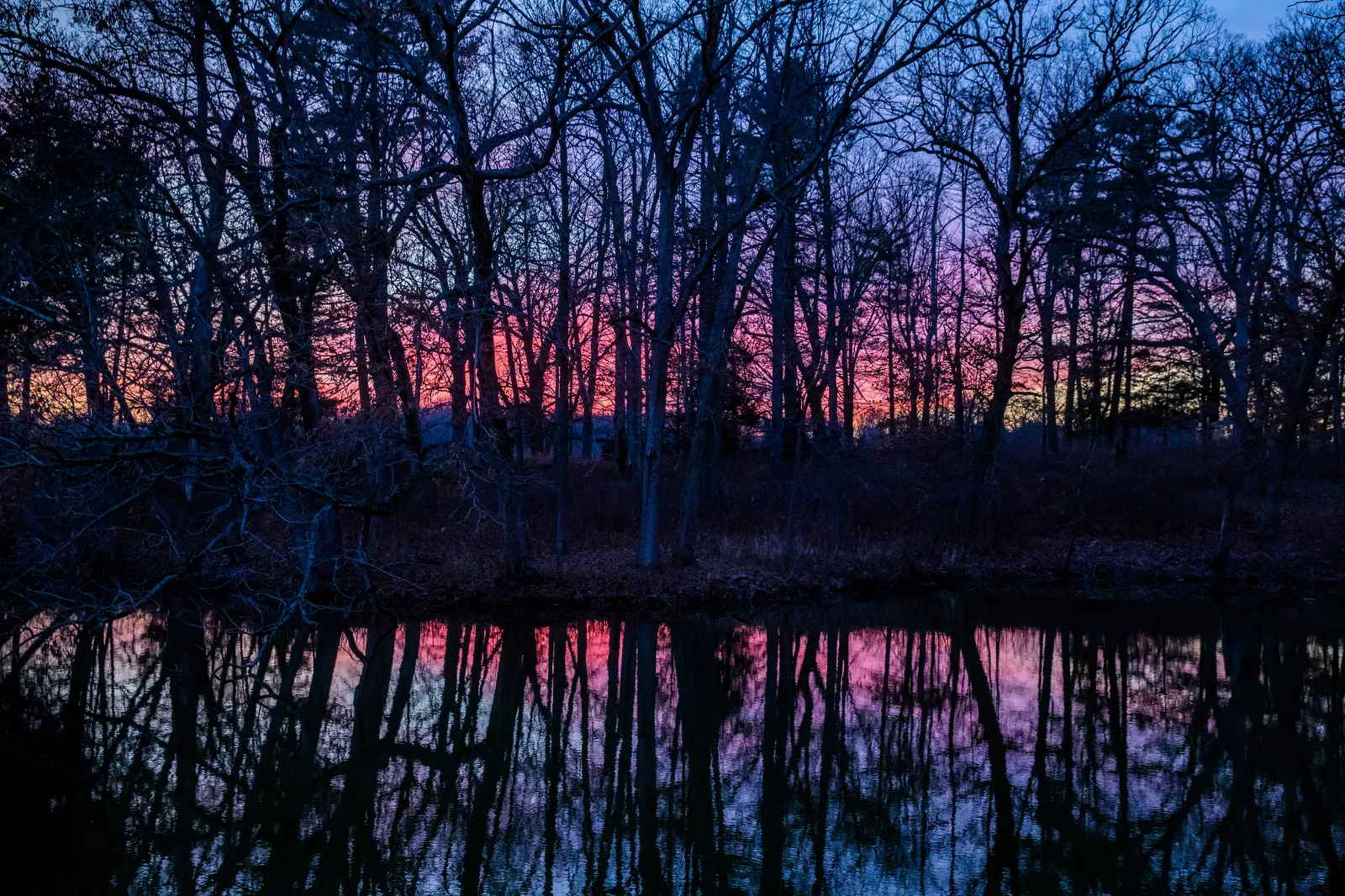 A Winter Solstice sunset descends over a serene pond scene on campus.