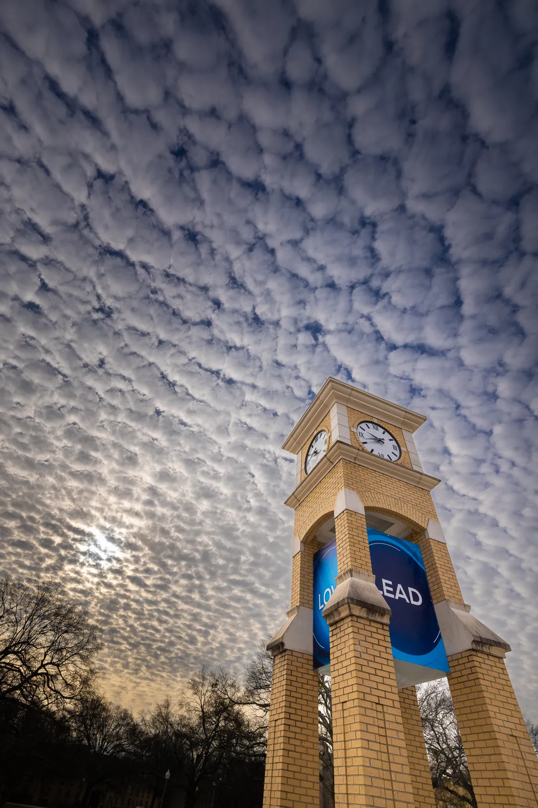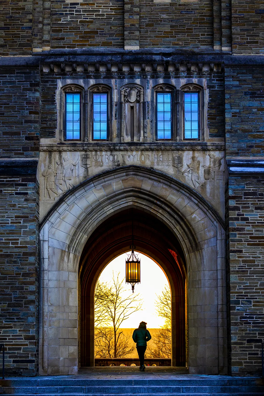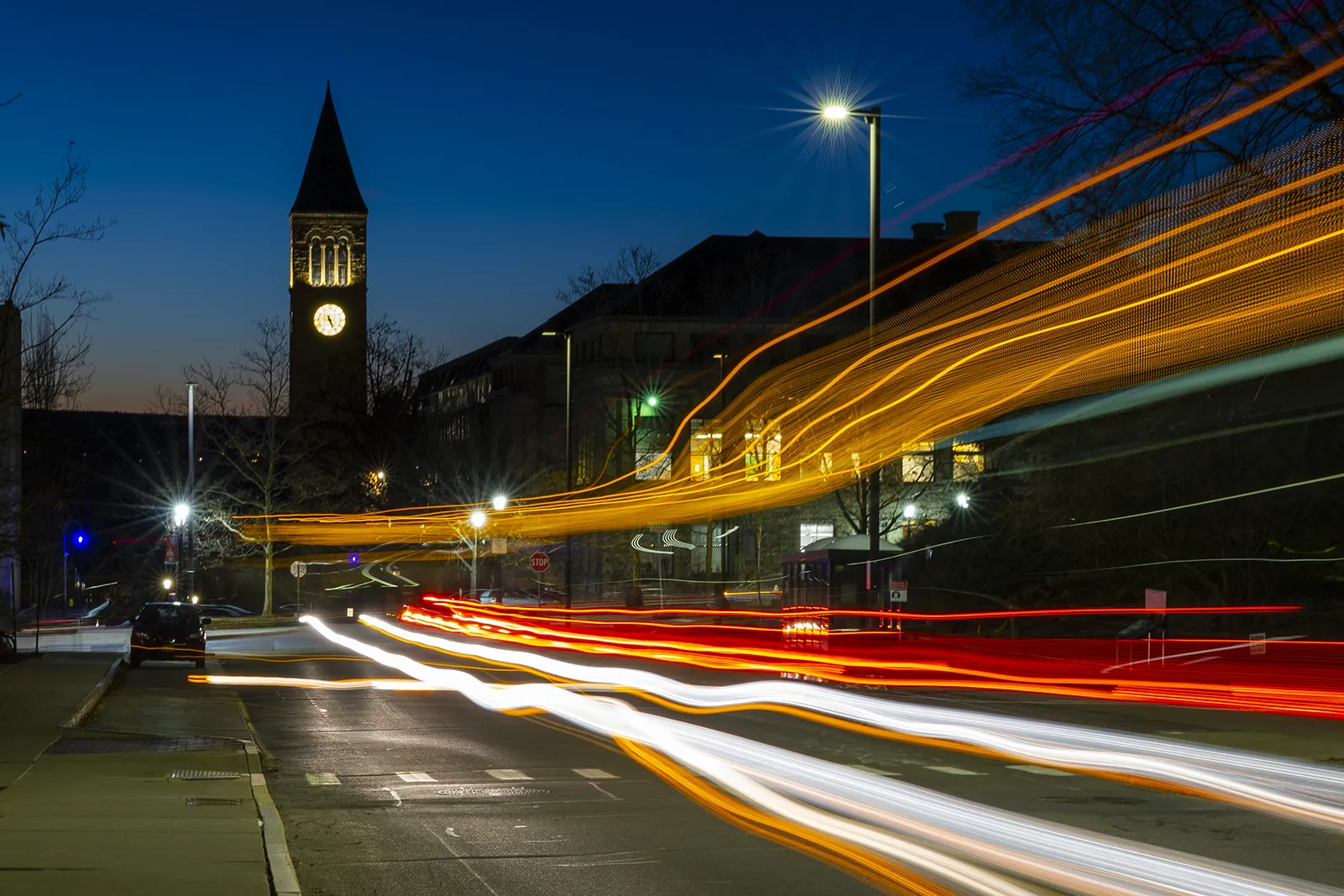 Cars and busses create light streaks on Tower Road as McGraw Tower is seen in the background.