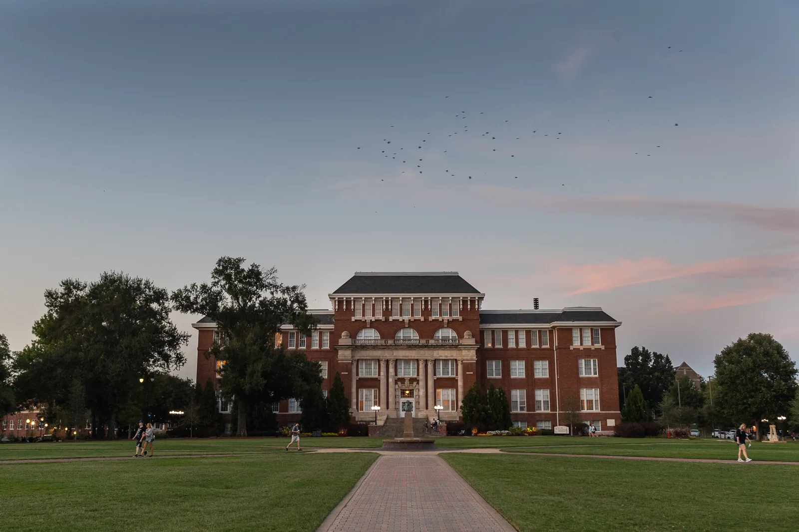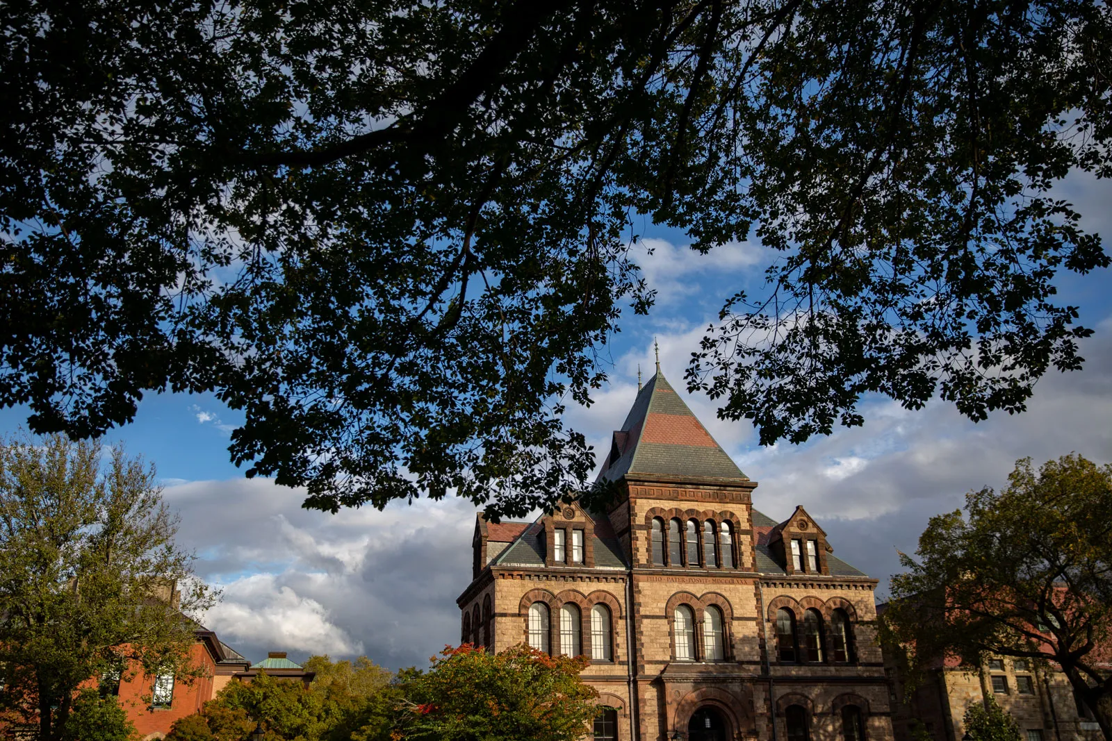 Sayles hall seen illuminated in early evening light through the Elm trees on the College Green.