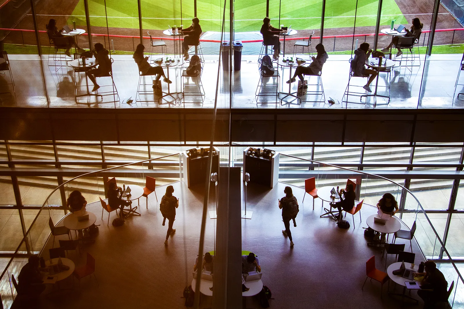 Students study and grab coffee in between classes in the lobby of Bill and Melinda Gates Hall.