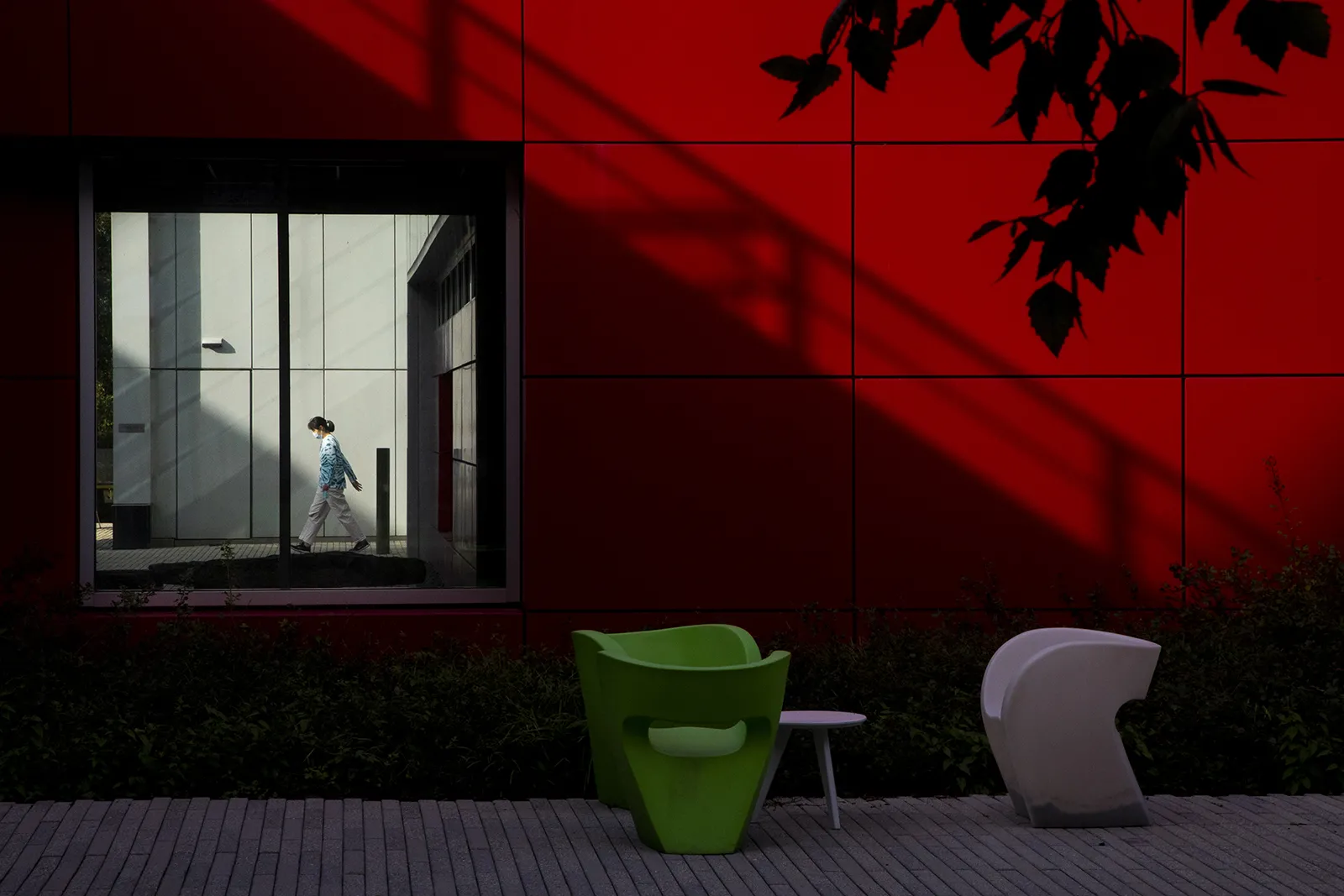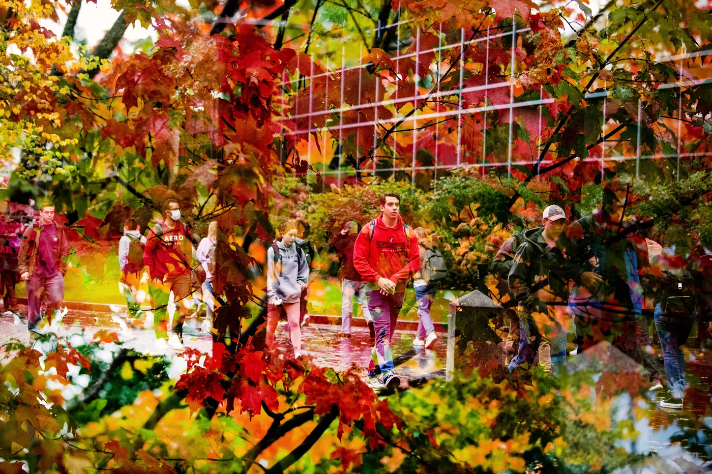 A person is framed by a window while exiting the Human Ecology Building on Cornell University's campus.
