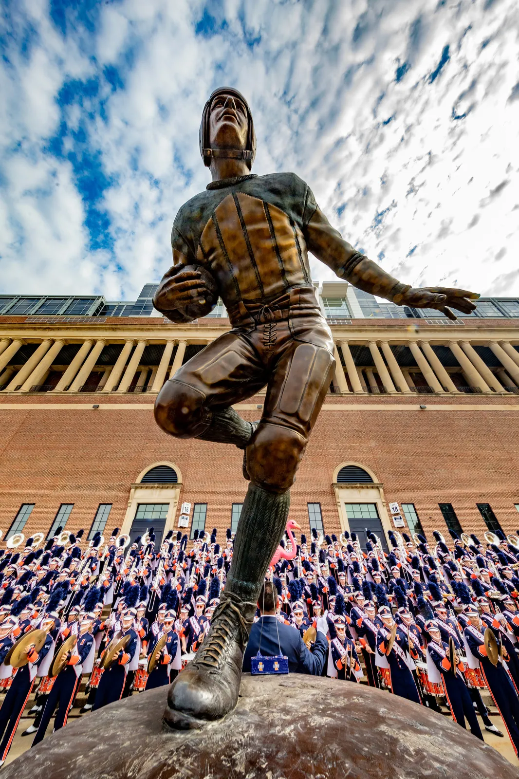 The Galloping Ghost, better known as Red Grange, looms large over Grange Grove as the band performs in front of Memorial Stadium.