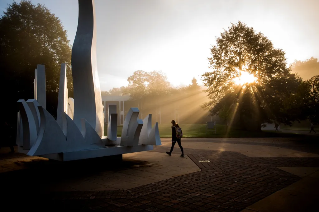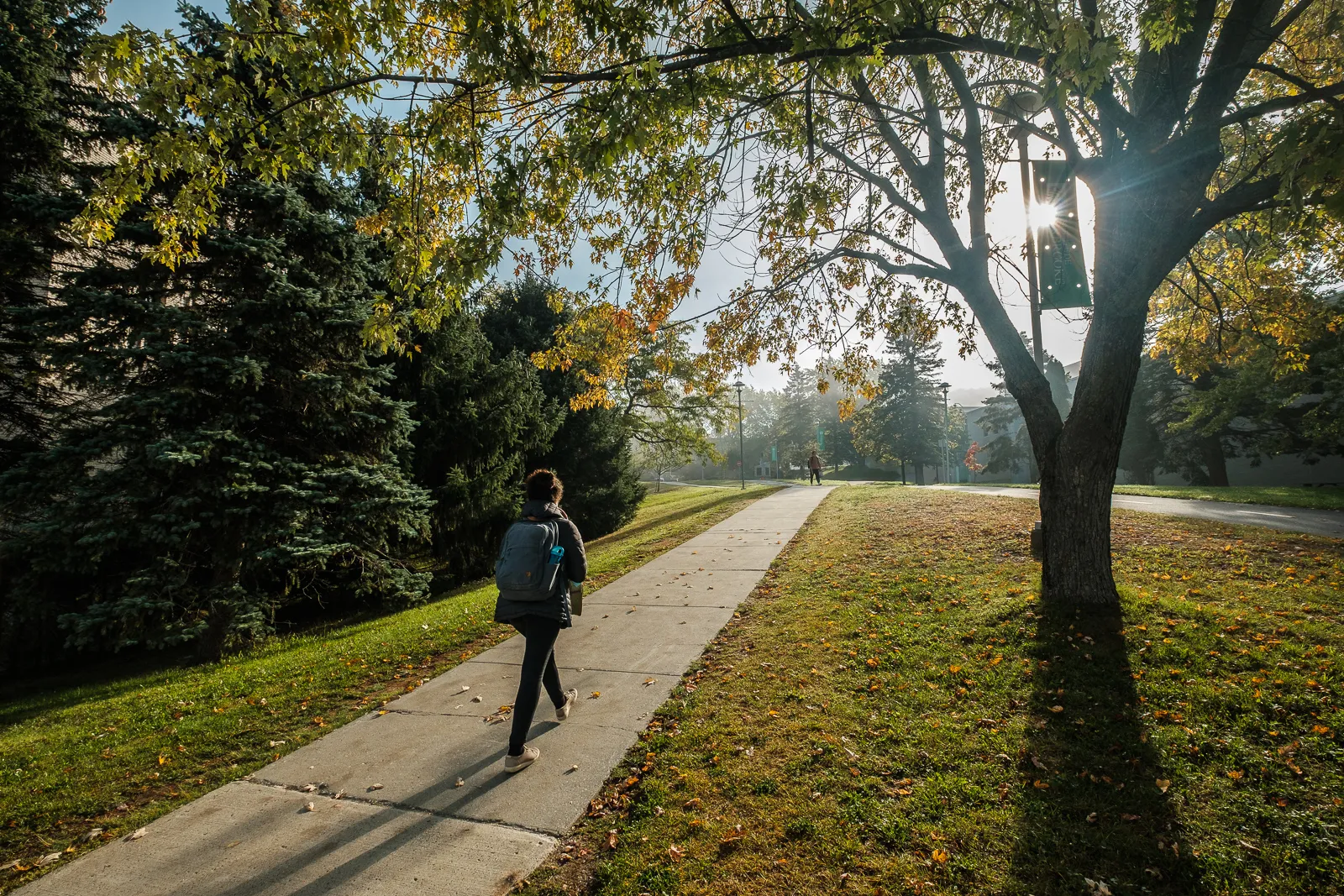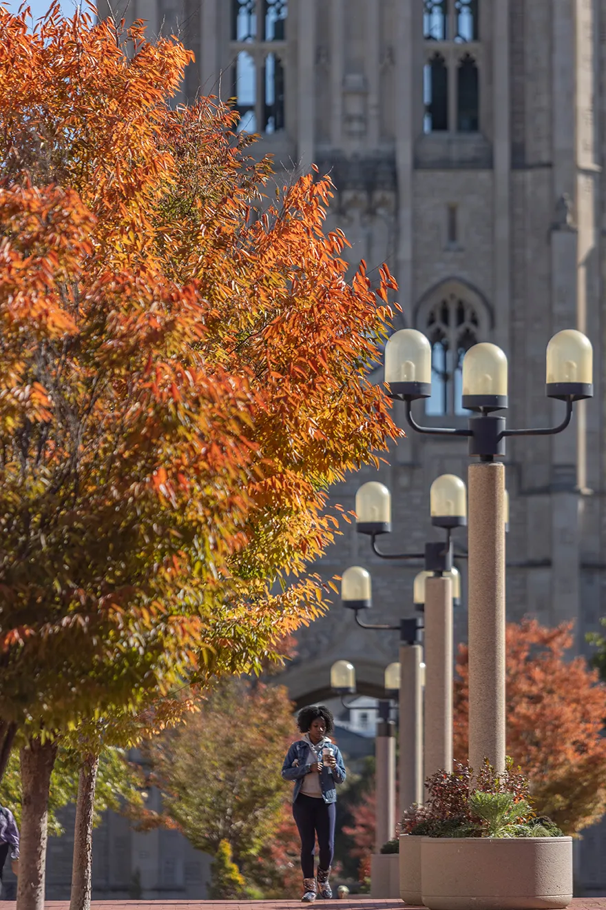 A student walks through the pedestrian-friendly campus near the library as the leaves turn to fall colors.