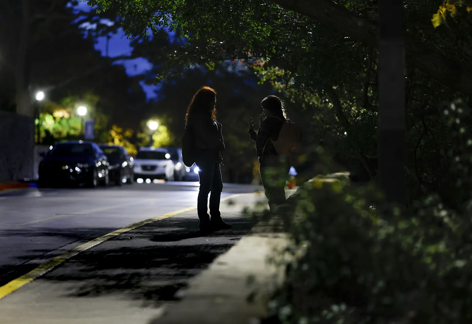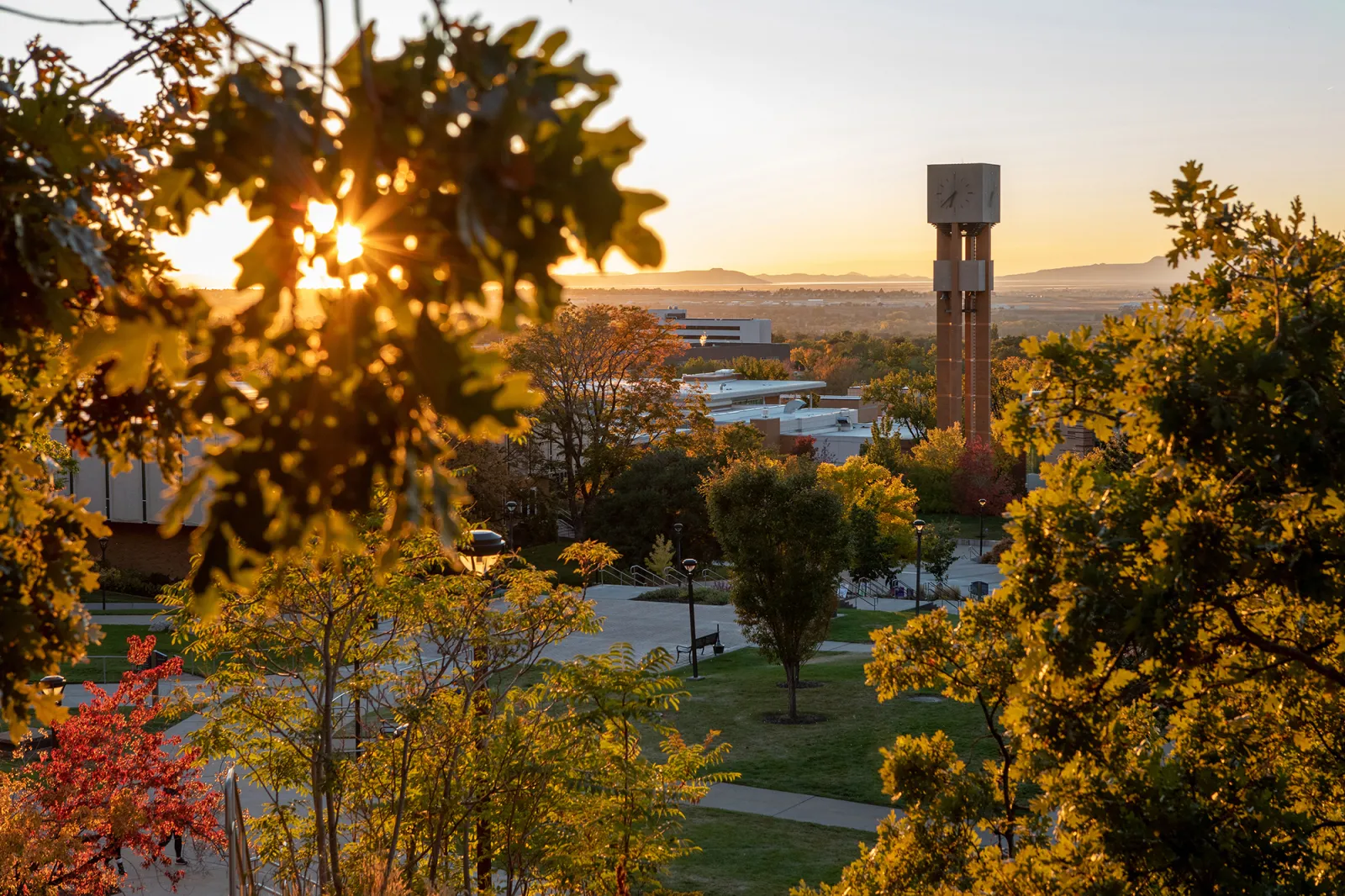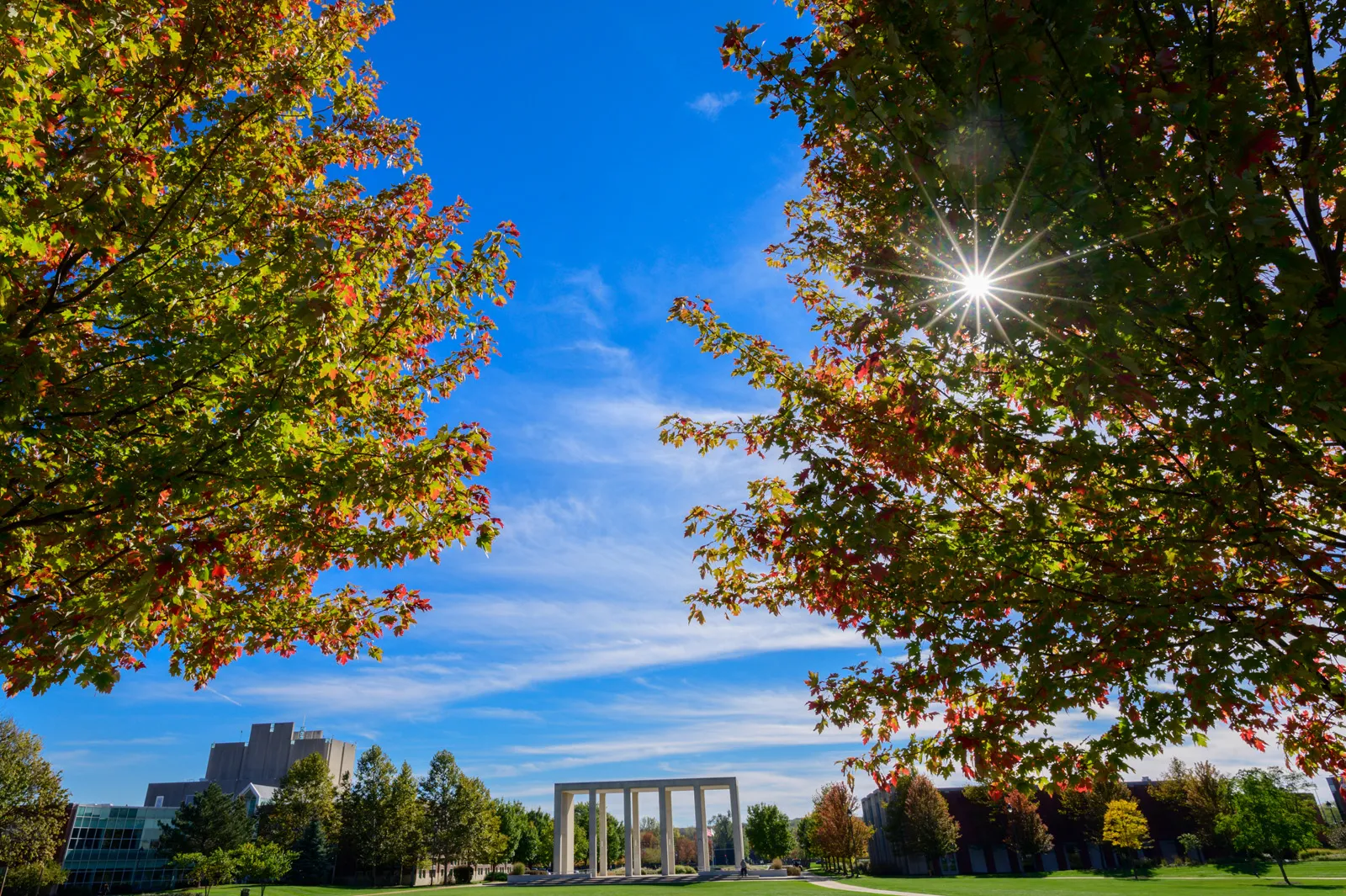 A student walks through the pedestrian-friendly campus near the library as the leaves turn to fall colors.