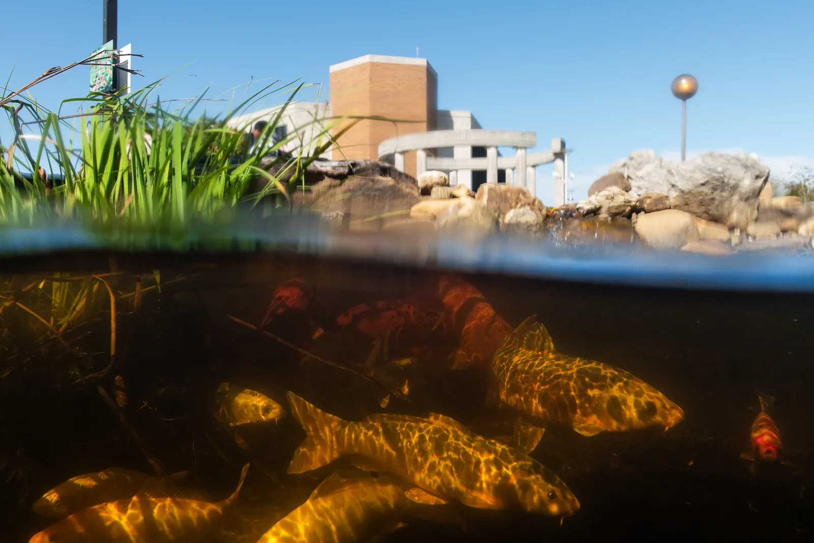 The University Koi, originally a gift from the governor in 2018, have become a fixture on campus in their pond on the quad. In answer to the most common question, yes, they overwinter just fine outside.