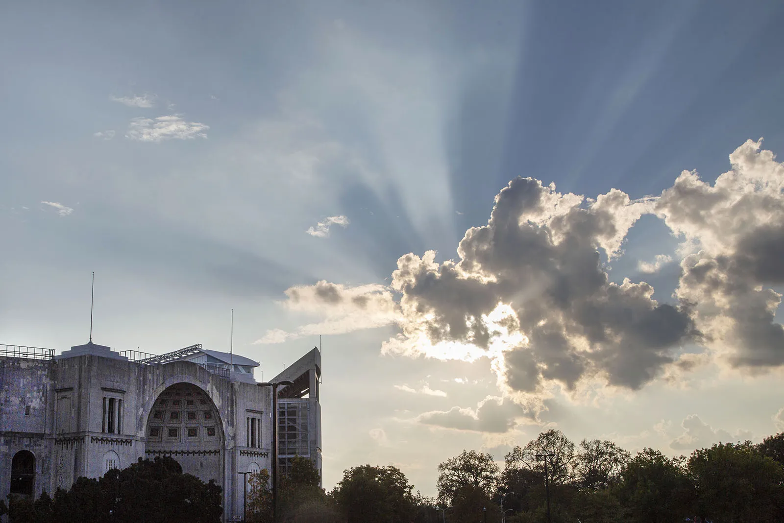 Light rays shine through clouds just before the start of the Homecoming Parade at the Ohio Stadium northwest parking lot Friday, October 8, 2021.