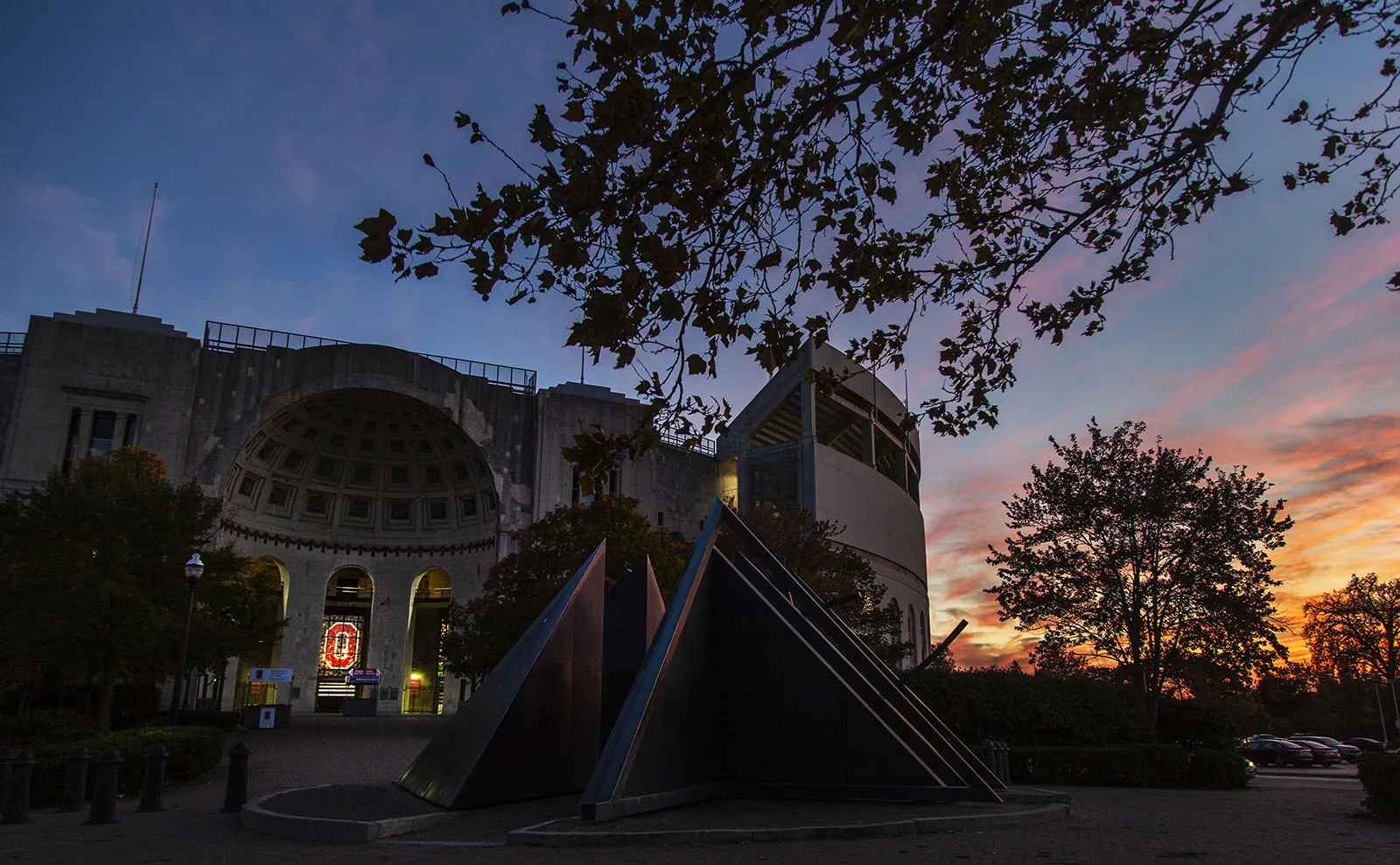 Twilight illuminates the sky behind Ohio Stadium Thursday, October 21, 2021.
