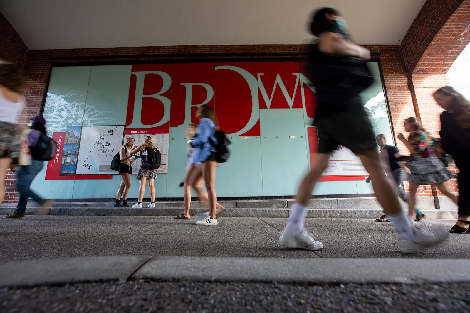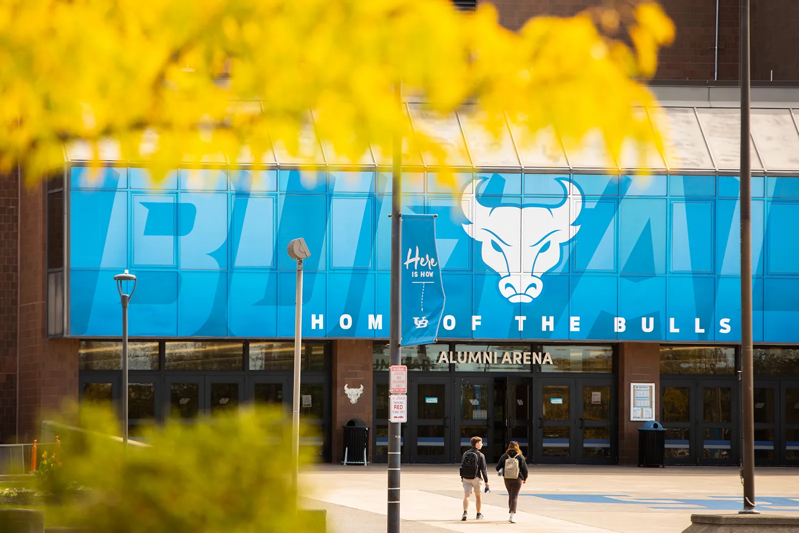 Students and fall colors around with the newly installed Alumni Arena banner on North Campus in September 2021.