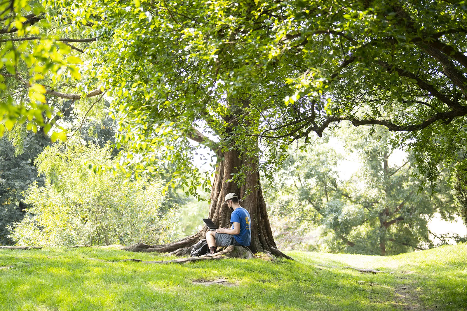 Not a giant, the roots of this redwood tree are a favorite study spot for students on campus, just ask Zach Lyons-Weiler, a chemistry, ecology and evolution major with a German language minor.
