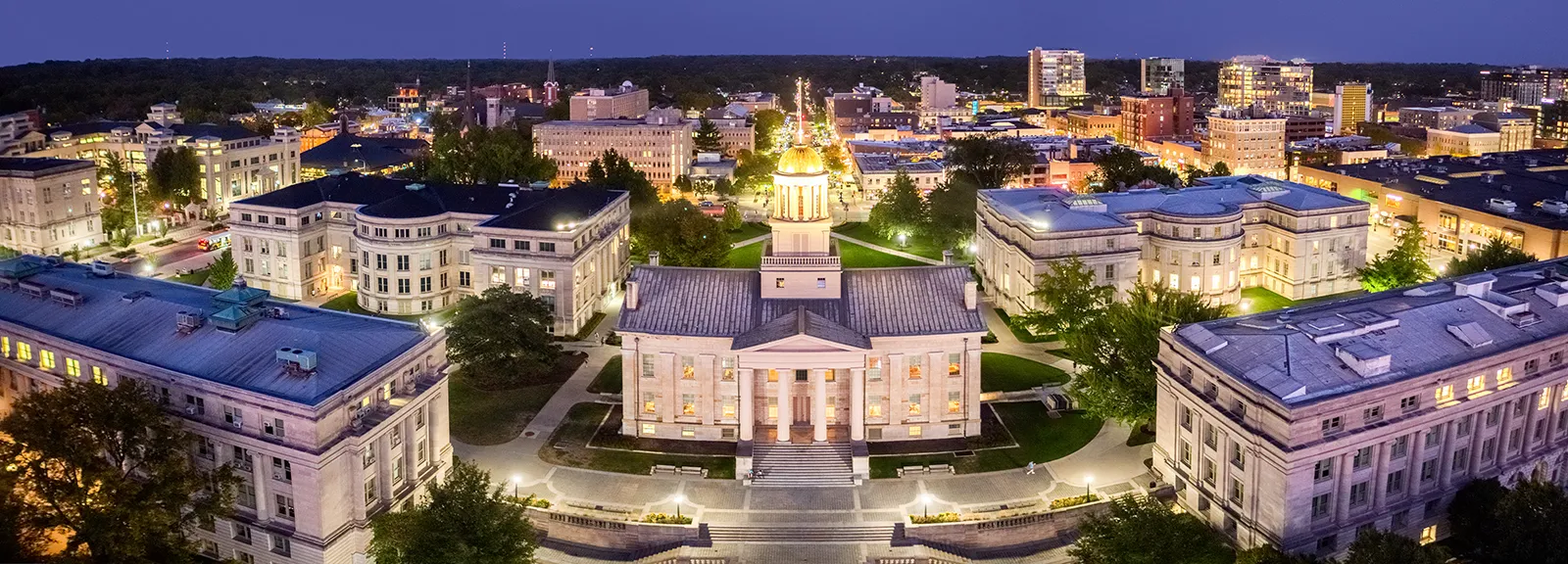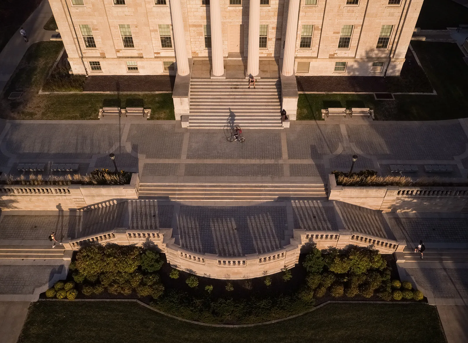 A biker rides past the steps of the Old Capitol on a late September evening.