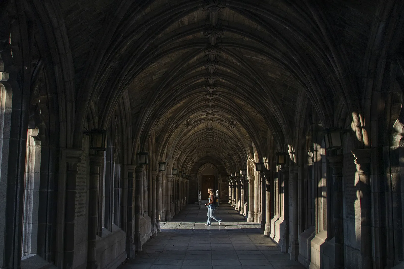 A student walks through the War Memorial cloister as the setting sun pours in during the late evening.